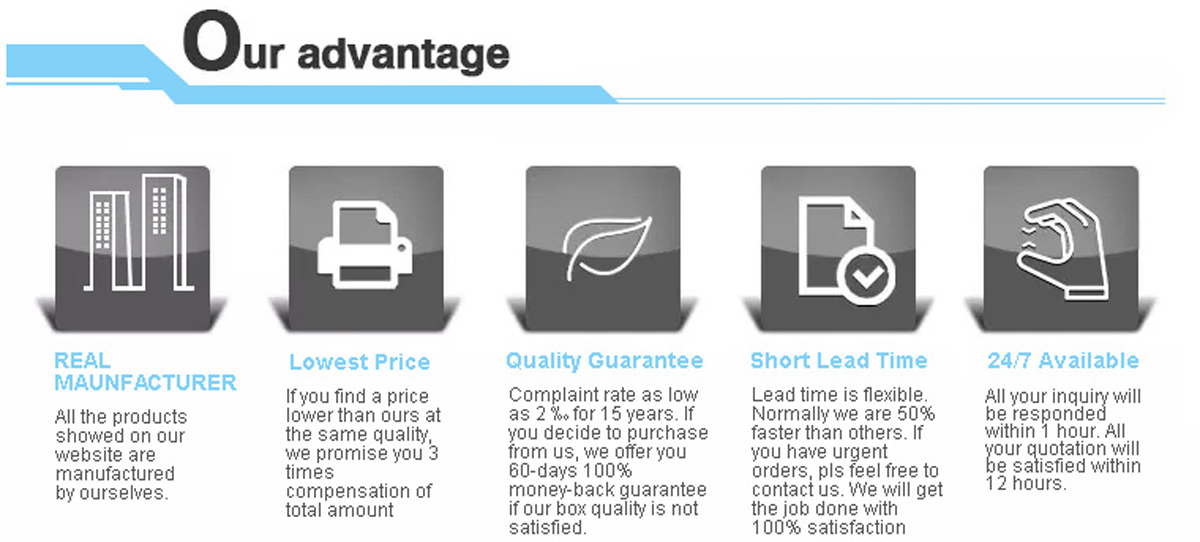 In tutti questi anni, abbiamo continuato a migliorare le nostre attrezzature di produzione, come la macchina per scanalature a V ad alta velocità, la fustellatrice automatica, il braccio meccanico, la macchina automatica per la schiumatura e la linea di produzione completamente assemblata. Abbiamo notevolmente ampliato la nostra capacità produttiva e garantiamo consegne rapide. Grazie al personale addetto al controllo qualità in ogni processo, possiamo fornire ai nostri clienti le confezioni regalo più qualificate.
