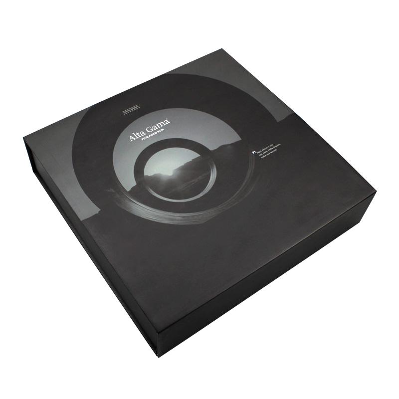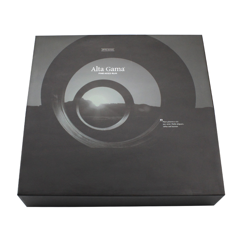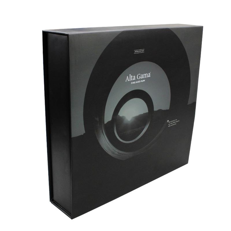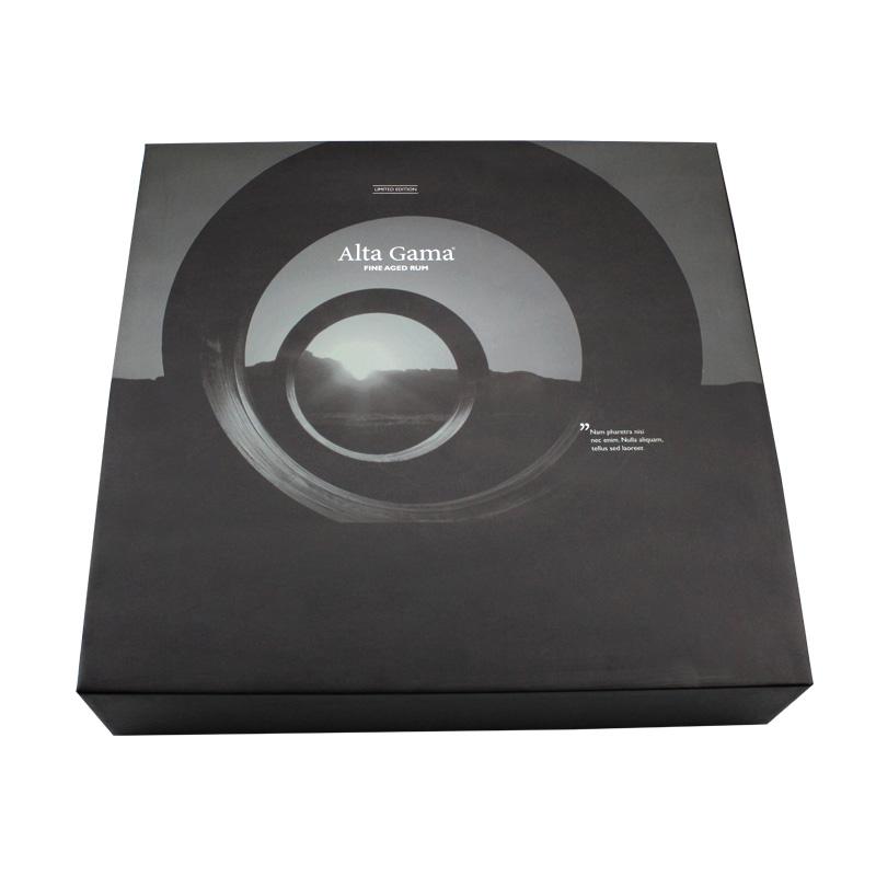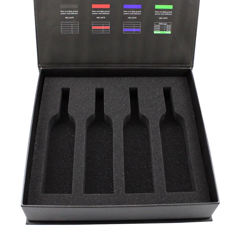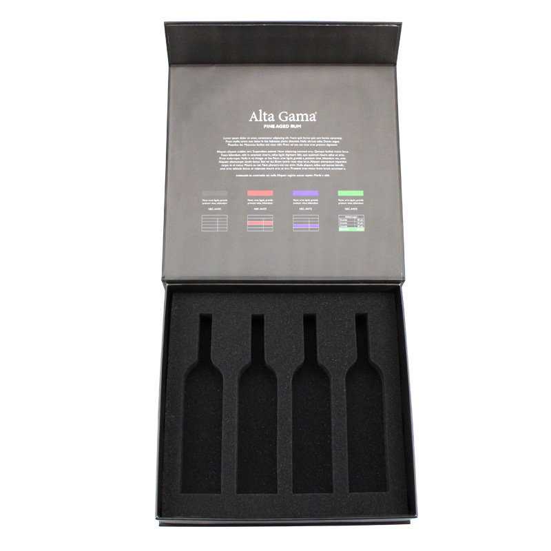 Questo è un nero imballaggio bottiglie scatola magnetica che ha fatto da 157 g di carta patinata C2S + cartone grigio da 2 mm, l'esterno della scatola presenta un rivestimento UV localizzato su un logo specifico che conferisce alla scatola un aspetto lucido e lussuoso, all'interno della scatola è presente un'imbottitura in spugna nera di forma personalizzata.
