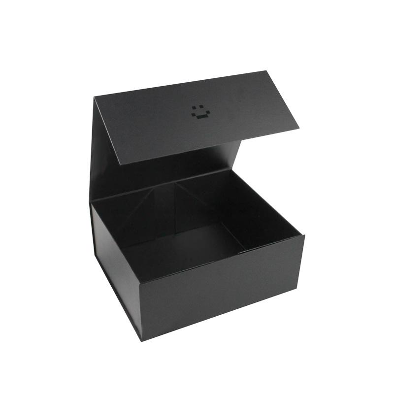 Questo è un colore blu opaco scatole regalo pieghevoli in carta nera che ha fatto con carta speciale nera + cartone grigio da 1200 g, grande logo realizzato con rivestimento UV sulla parte superiore del coperchio senza stampa.