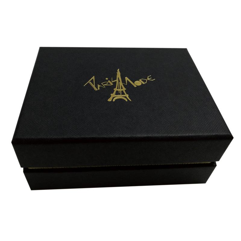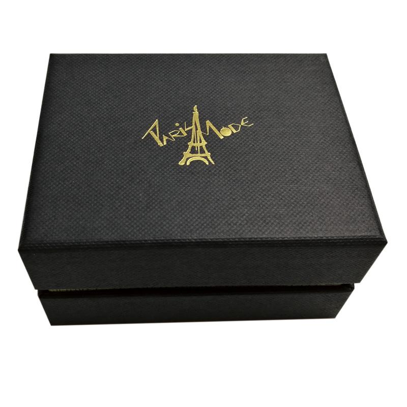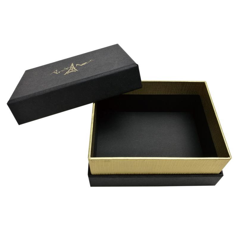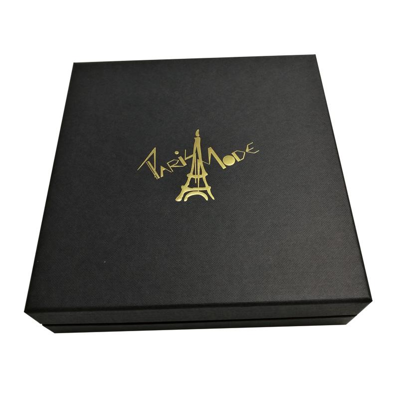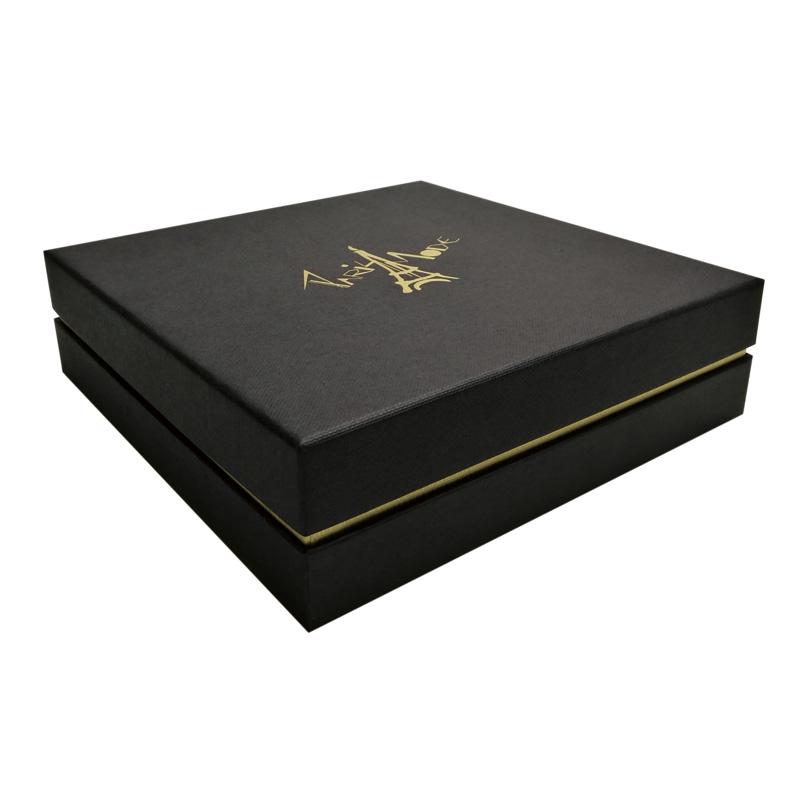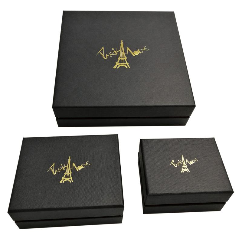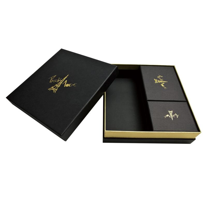 Questo è un set di lusso coperchio nero e scatola inferiore che ha fatto con carta speciale testurizzata + cartone grigio da 1200 g, il bordo della base è realizzato con carta speciale dorata e il logo sulla parte superiore della scatola è stampato in lamina d'oro. C'è una scatola grande per contenere 3 scatole più piccole di diverse dimensioni.