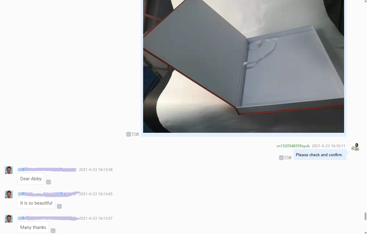 Alla fine acconsentì alla nostra idea. Dopo aver confermato il design di stampa con lui, il campione della scatola è stato completato in 3 giorni. Gli abbiamo inviato foto e video come riferimento. Gli è piaciuto moltissimo.