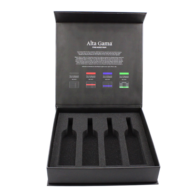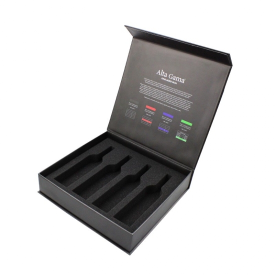 Questo è un inserto in schiuma all'interno della scatola di imballaggio che ha fatto con carta artistica C2S da 157 g + cartone grigio da 1200 g, logo esterno con rivestimento UV, informazioni di contatto stampate all'interno della scatola e spugna che può essere personalizzata di conseguenza.