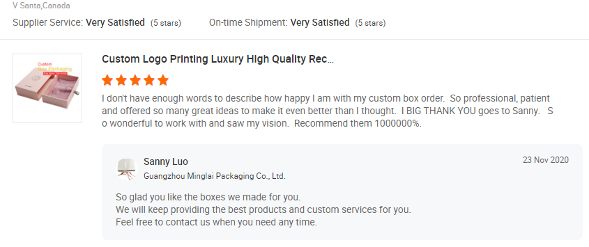 Dopodiché Jonathan mi presenta il suo capo, Virginia. Abbiamo chiacchierato piacevolmente e confermato ogni dettaglio della scatola con cassetto scorrevole e sacchetti di raso. Abbiamo completato il campione entro una settimana, ho inviato video e immagini a Virginia per confermare il campione.