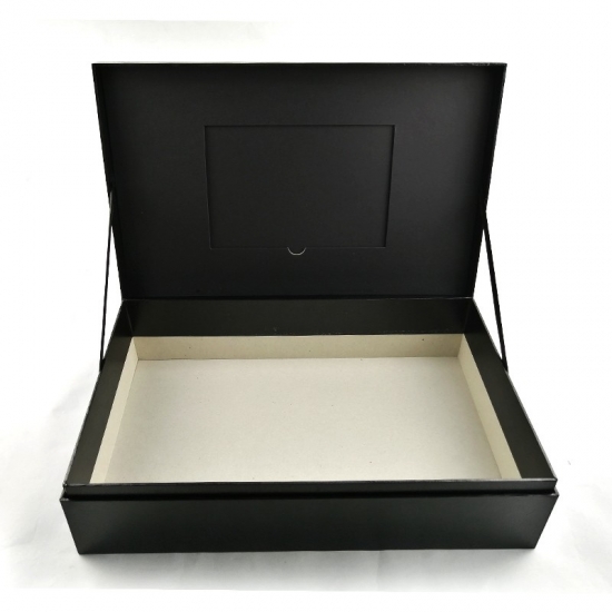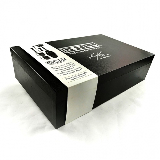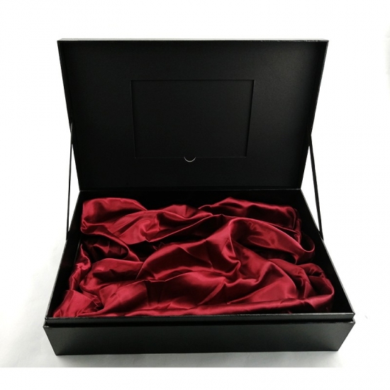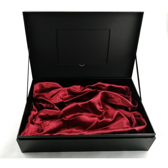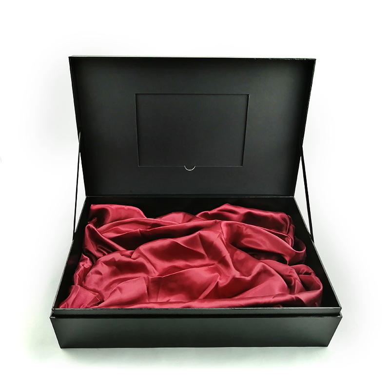 Questo è un scatola regalo a conchiglia nera che ha fatto da 157 g di carta patinata C2S + cartone grigio da 2 mm, il logo all'esterno della scatola è stampato in lamina d'argento, il che potrebbe rendere la scatola più pregiata e unica, l'inserto interno della scatola è in raso di buona qualità che decora i prodotti all'interno della scatola.