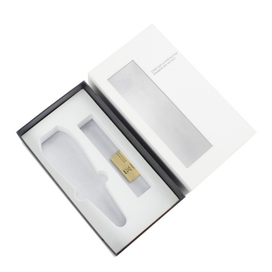Si tratta di una scatola con coperchio trasparente e base con inserto in EVA bianco, realizzata in carta patinata C2S da 157 g + cartone grigio da 2 mm, coperchio superiore bianco e base nera, dotata di coperchi in PVC trasparente che consentono di vedere il tipo di prodotti contenuti nella scatola.