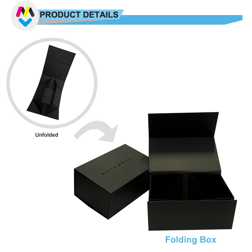 Questa scatola è realizzata in cartoncino nero da 120 g/m² plastificato con cartoncino rigido premium da 1200 g/m². È una scatola regalo pieghevole magnetica, con rivestimento UV e logo in rilievo sul coperchio superiore e sito web sul fondo. È semplice ma dall'aspetto davvero classico.