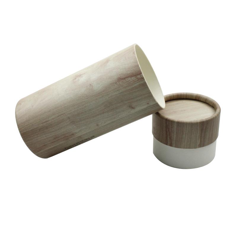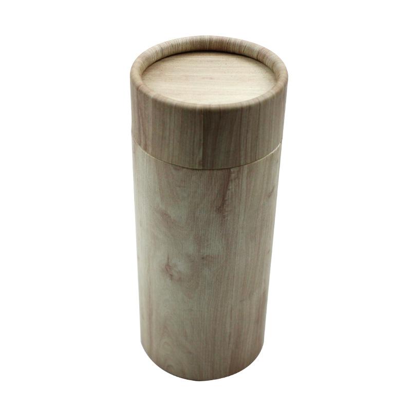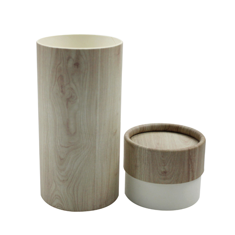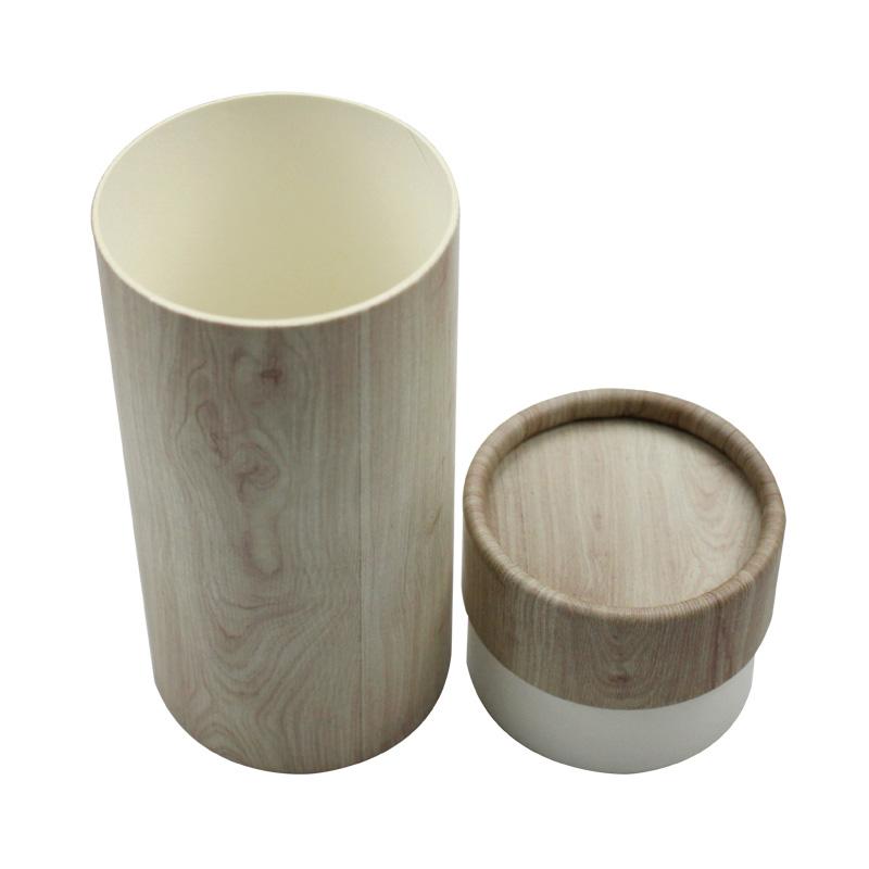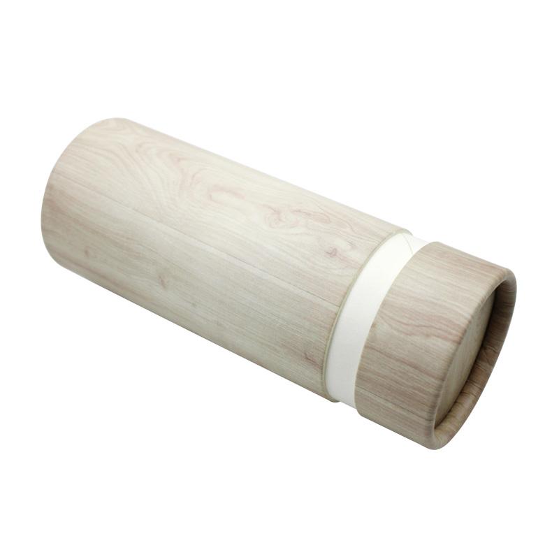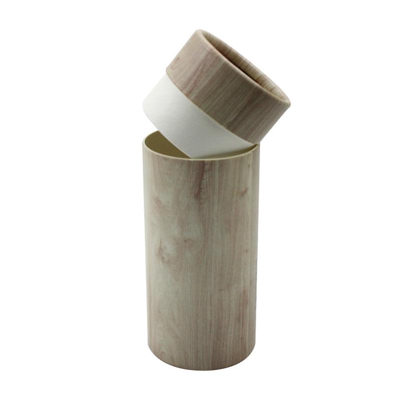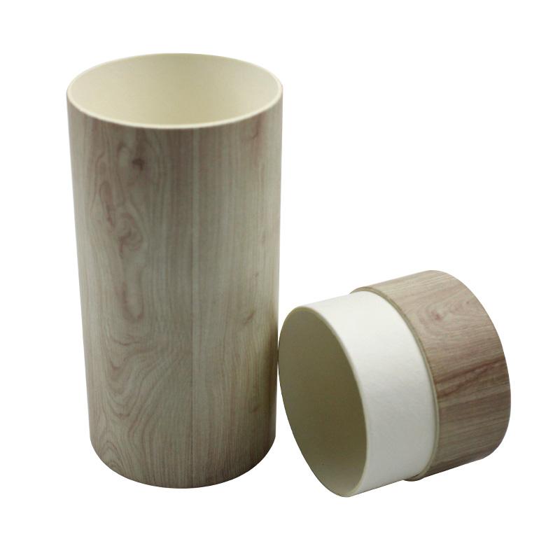 Questo è un scatola regalo rotonda con coperchio realizzato in carta speciale effetto legno. Sembra una scatola da imballaggio in legno di alta qualità.