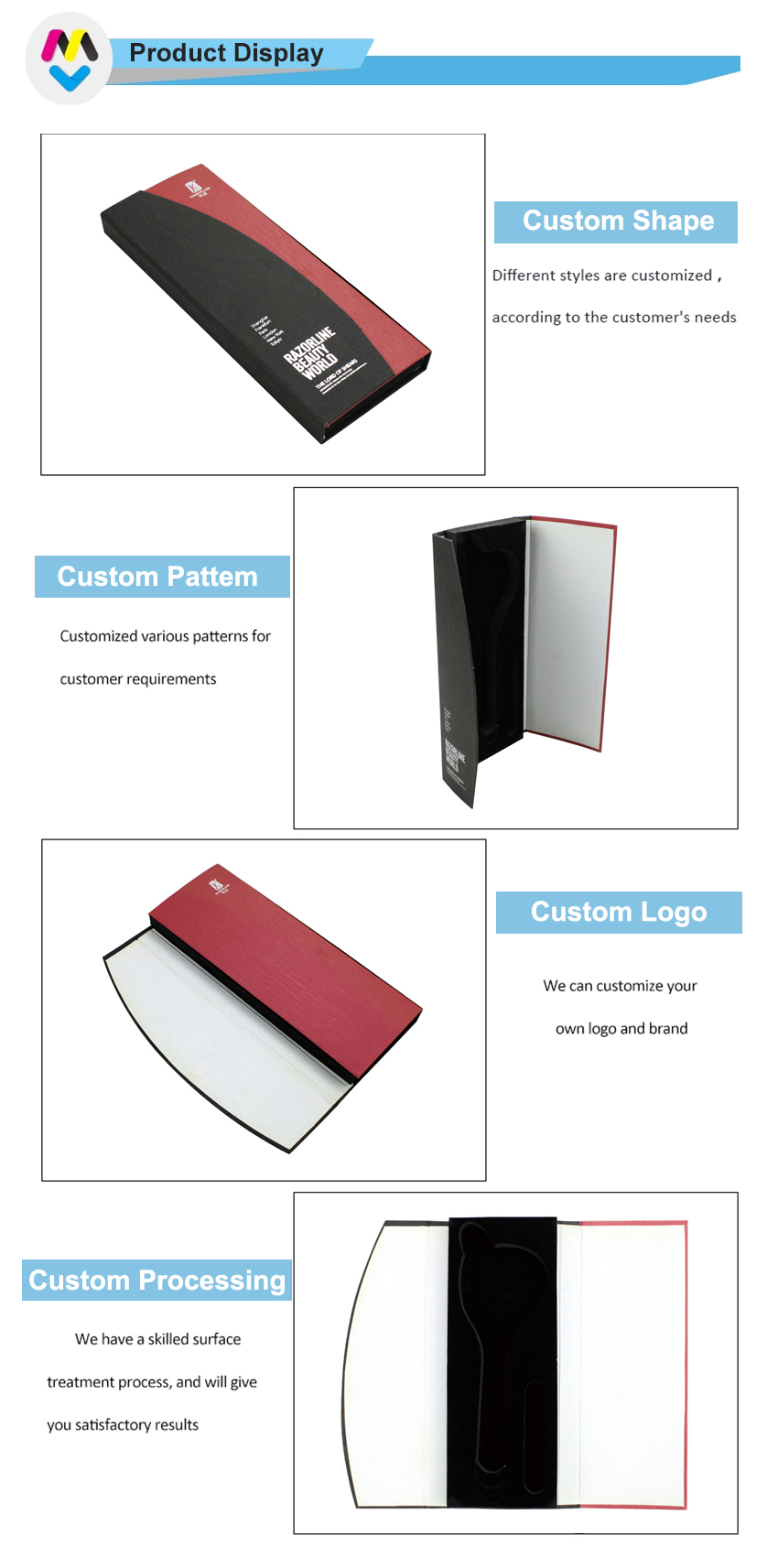 Nota: tutte le foto dei prodotti che abbiamo pubblicato sul nostro sito web sono solo per riferimento sul tipo di imballaggio che possiamo realizzare, non significano che vendiamo lo stesso prodotto in magazzino. Ci concentriamo su imballaggi di carta personalizzati di qualsiasi dimensione/colore/struttura e così via.