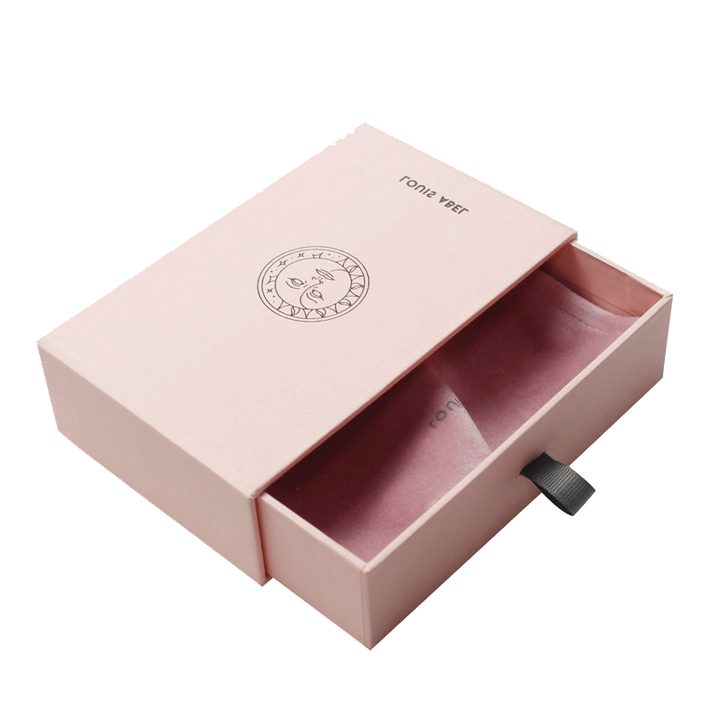 Questa scatola con cassetto e nastro rosa è realizzata in carta goffrata rosa da 120 g/m², plastificata con cartoncino rigido da 2 mm. Logo e testo sono stampati in grigio Pantone; è inclusa anche una morbida custodia in velluto con logo personalizzato stampato per proteggere il prodotto all'interno. Qualsiasi dimensione, colore e finitura può essere personalizzata per te.