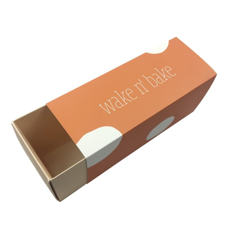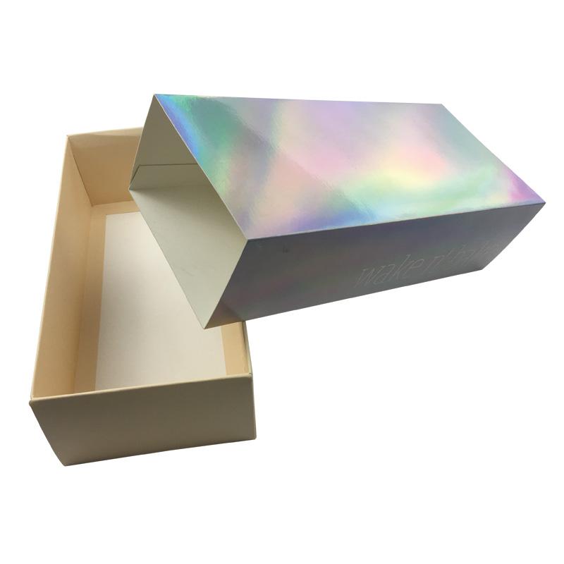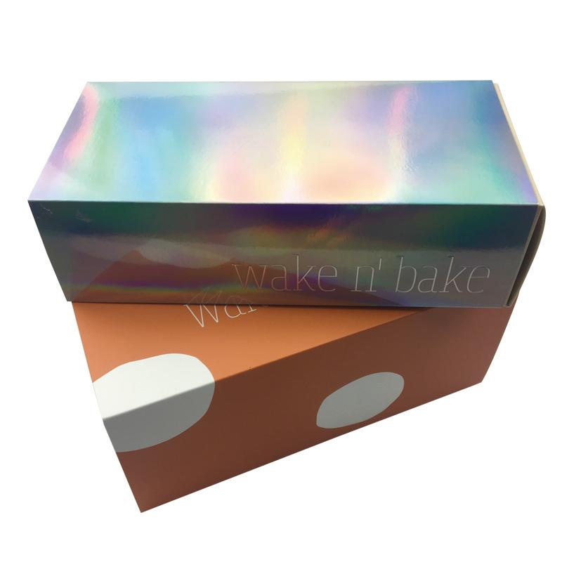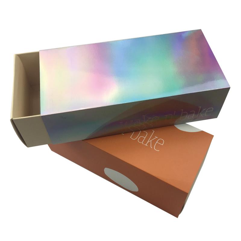 Scatola pieghevole con cassetto e logo stampato dal design popolare, realizzata in cartone bianco da 350 gsm, con o senza 25 gsm Lamina olografica avvolta sulla superficie. È più economica delle scatole rigide in cartone con cassetti, e consente anche di risparmiare sui costi di spedizione.