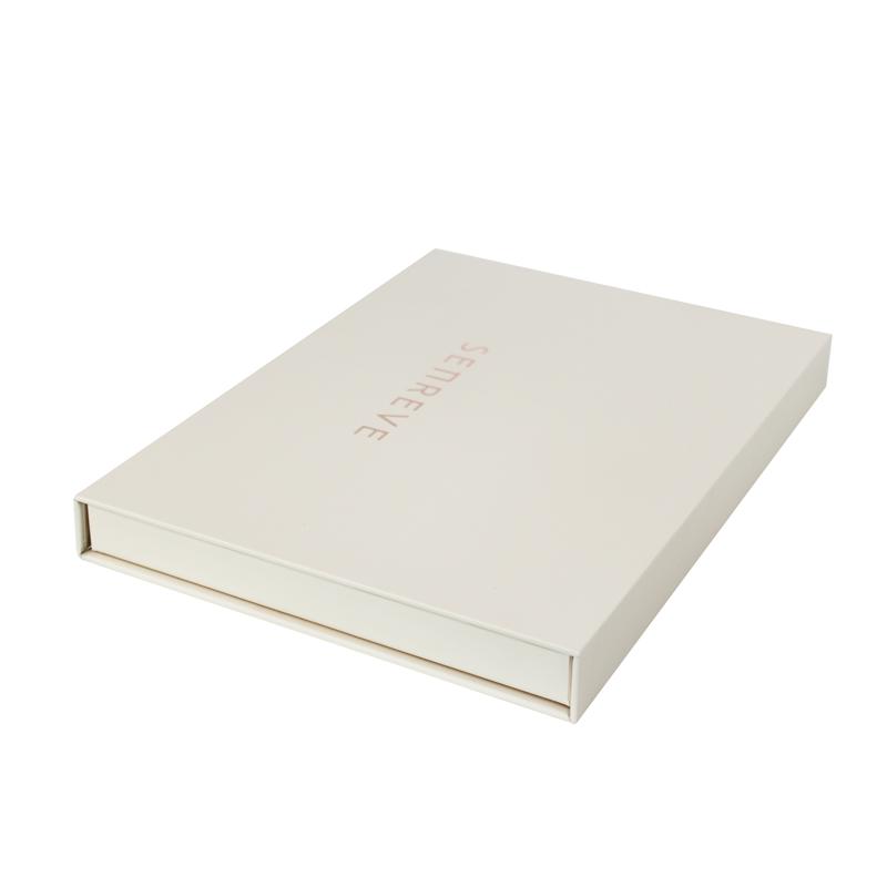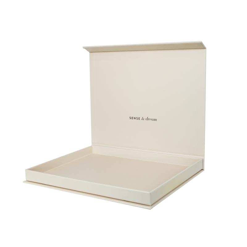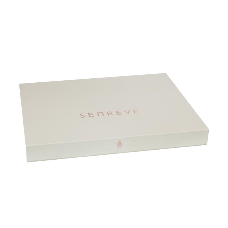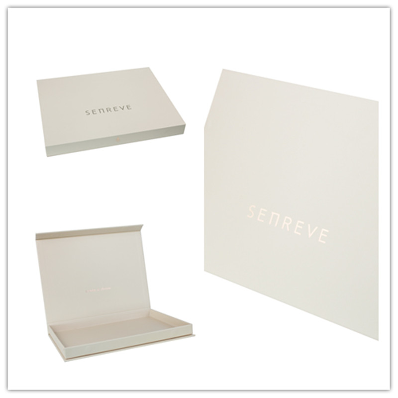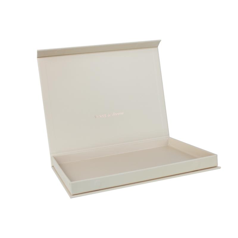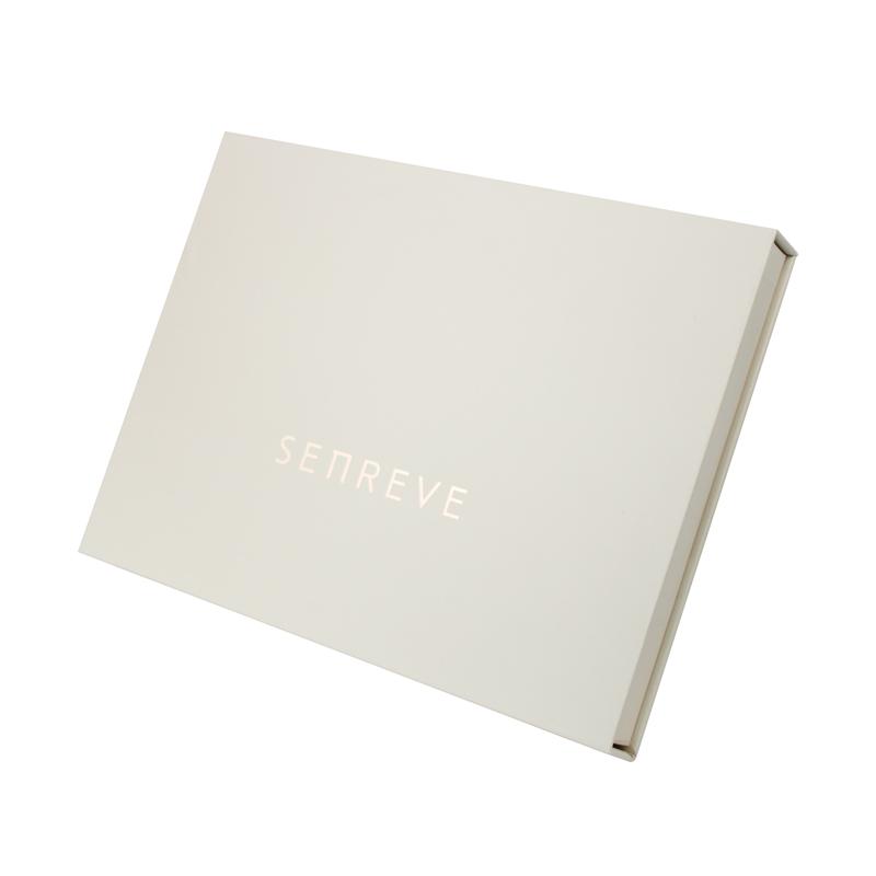 Questo Scatola regalo a forma di libro Realizzato in carta patinata da 157 g/m² plastificata con cartoncino grigio di alta qualità da 2 mm, con potente chiusura magnetica. Il logo è stampato a caldo in lamina color oro rosa chiaro. Semplice ma classico.