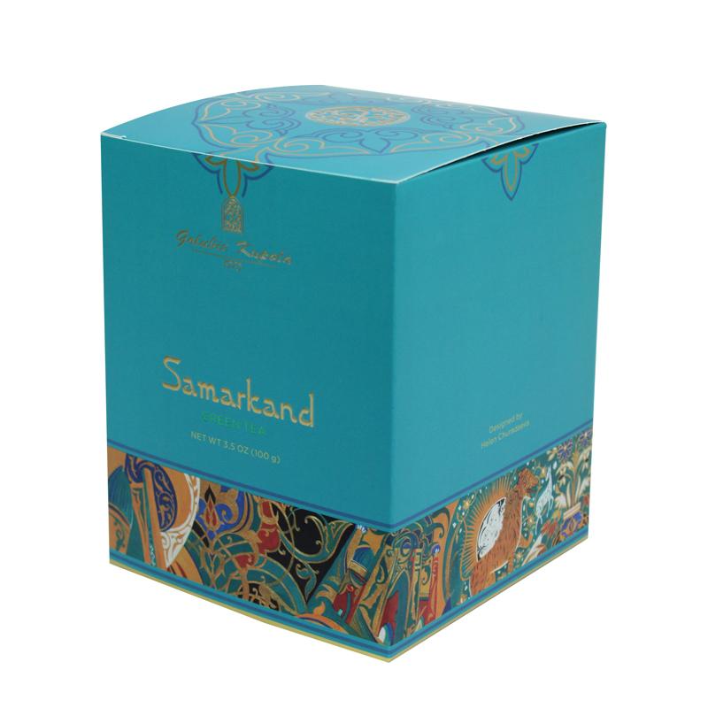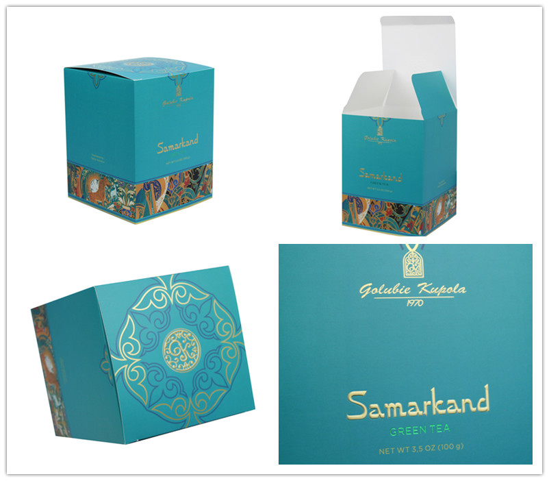 Questa scatola è realizzata in cartoncino da 300 g/m² con stampa a colori. Il nome del marchio è ben impresso grazie alla lamina dorata in rilievo e al goil verde per il nome del tè. Sono disponibili vari colori di lamina per informazioni di branding uniche.