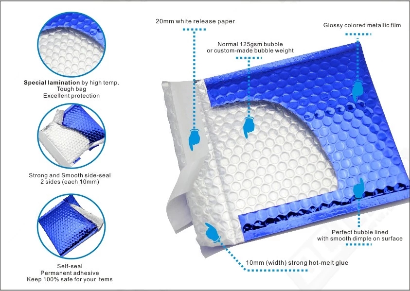 Materiale del prodotto: pellicola alluminata + polietilene a bolle. Il colore della pellicola alluminata e il contenuto della stampa possono essere personalizzati.