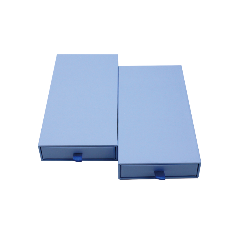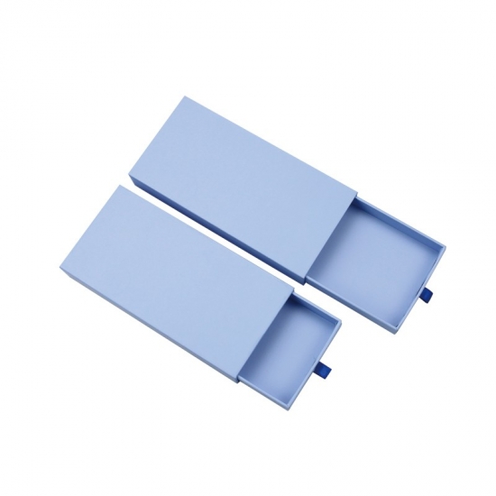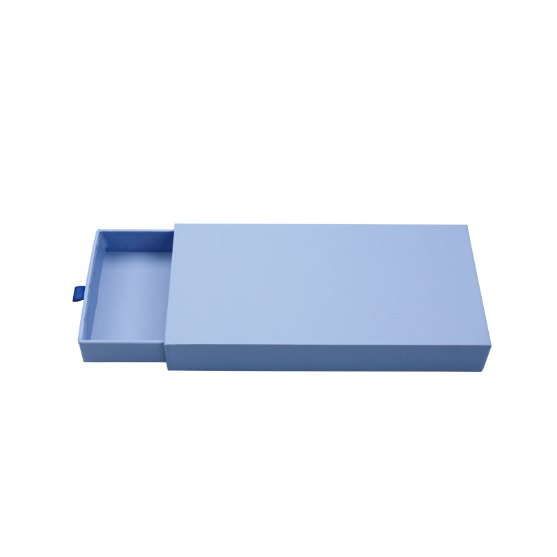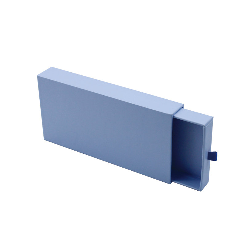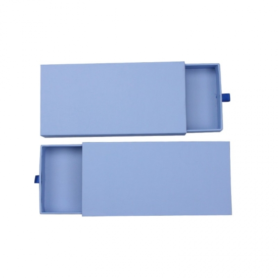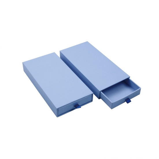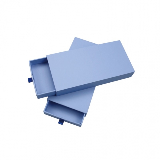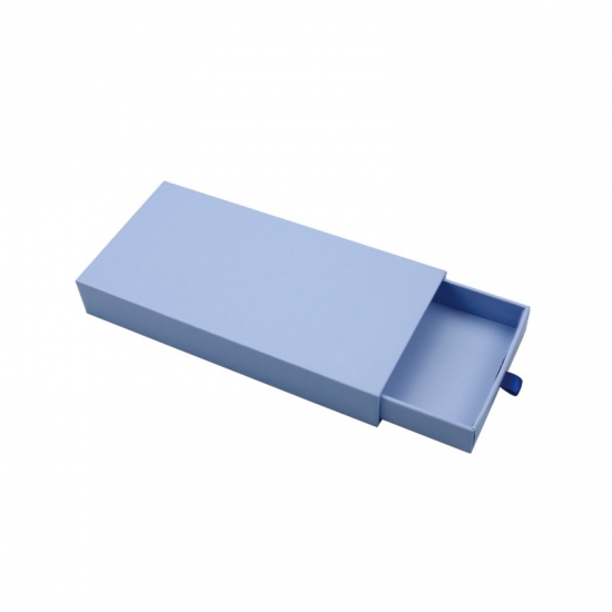 È un blu scivolare D cassetto scatola con tiranastro che ha fatto da 157 g di carta artistica C2S + 1200 g di cartone grigio L'intera scatola è piena di stampe monocromatiche blu, senza alcun motivo.