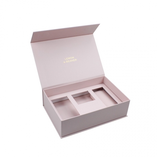 La scatola regalo magnetica decorativa rosa è realizzata con carta artistica C2S da 157 gsm laminata con un vassoio interno in cartone grigio da 2 mm, vassoio di carta, laminazione opaca, stampa a caldo di colore rosa.