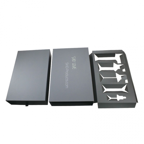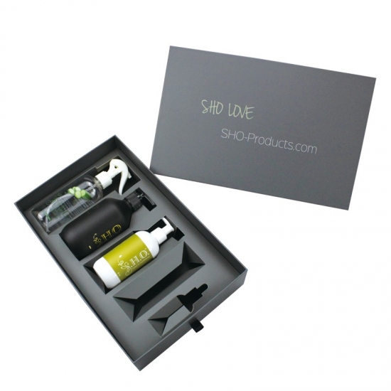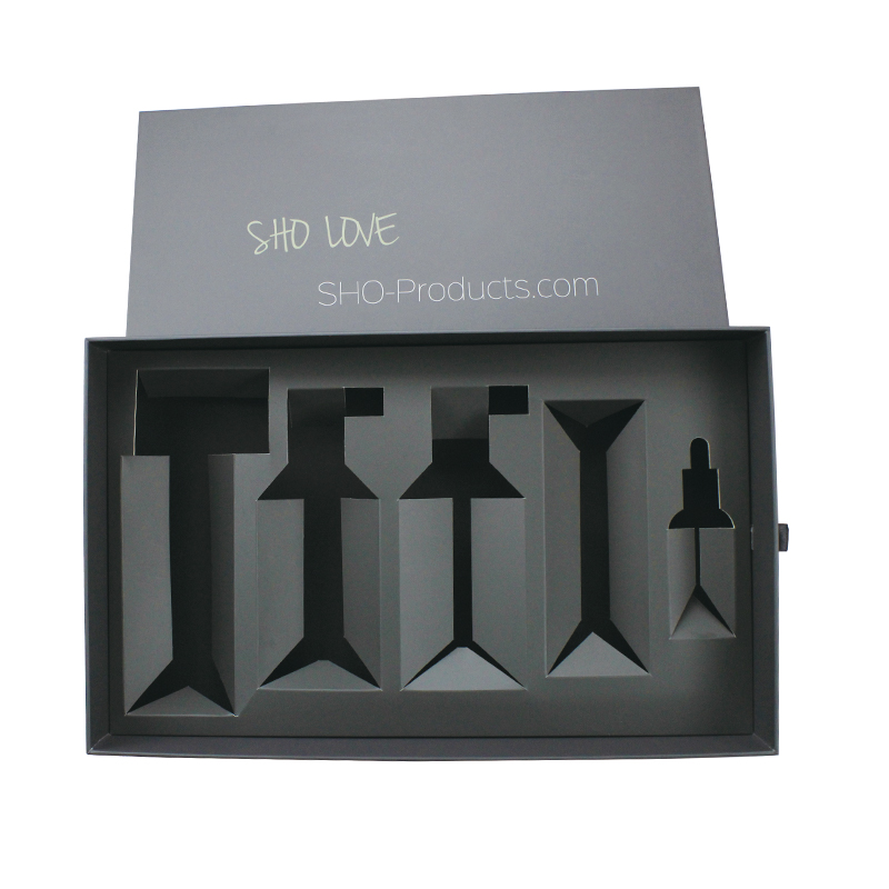 È un scatola con cassetto in cartone con tiranastro che ha fatto da 157 g di carta artistica C2S + 1200 g di cartone grigio ,pieno di stampe all'esterno e all'interno della scatola, ci sono inserti in cartone di carta che prendono la forma personalizzata in base ai prodotti all'interno della scatola.