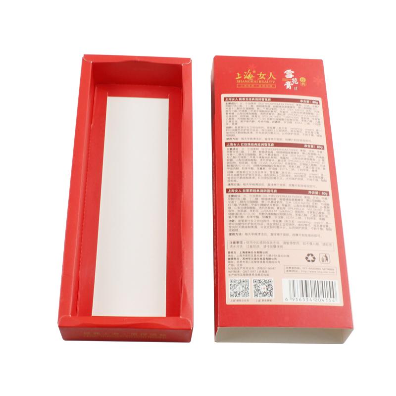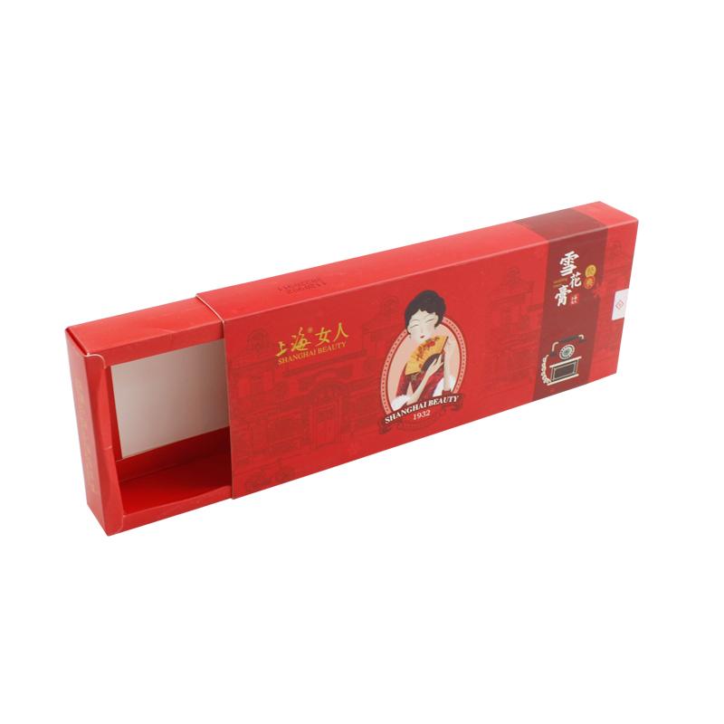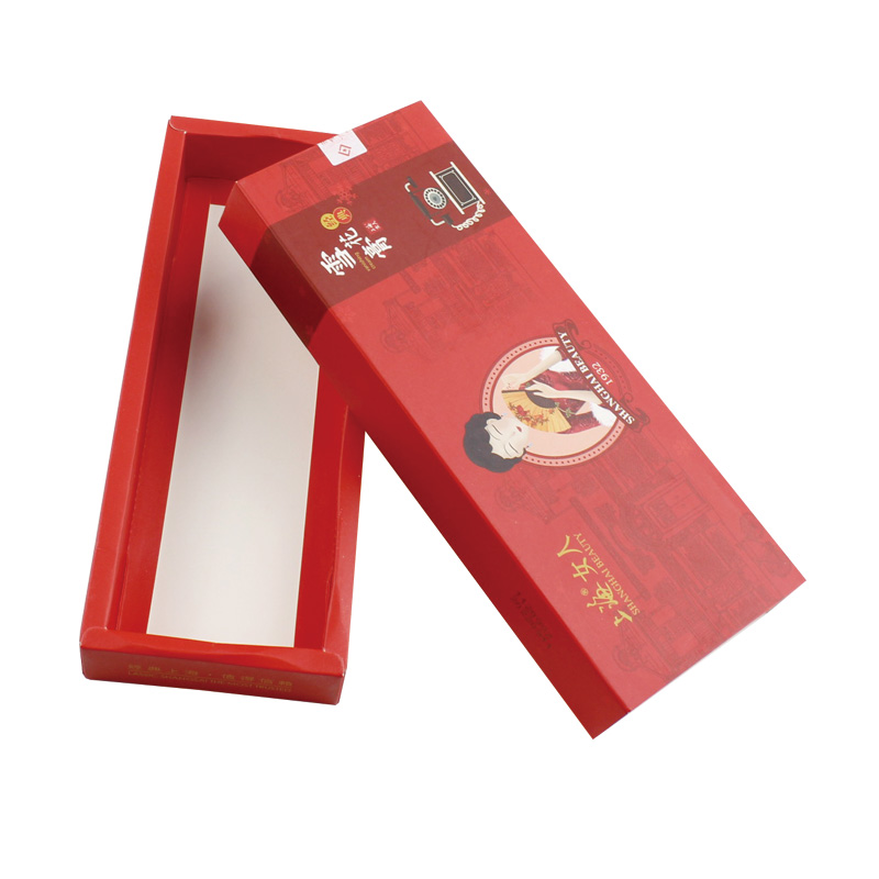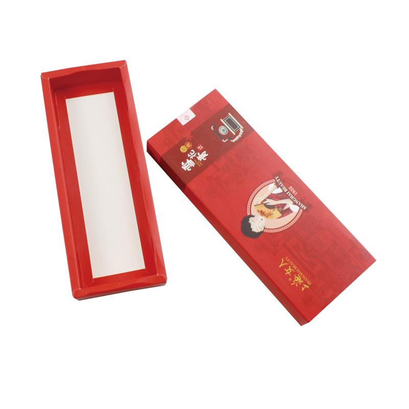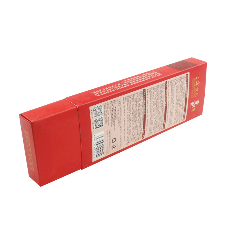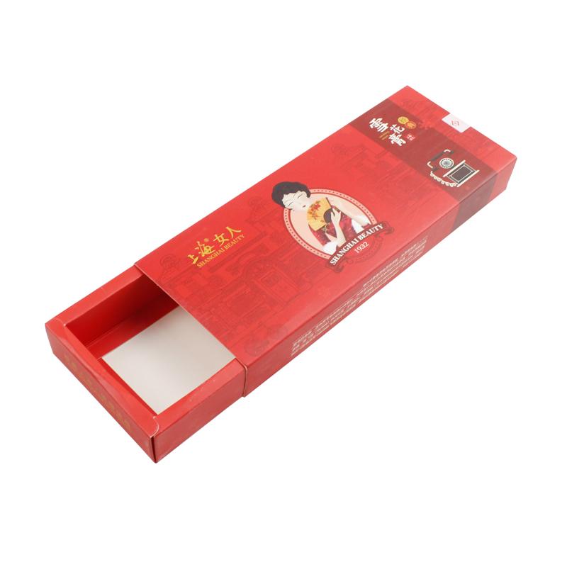 Questo è un scatola con cassetto piatto che ha fatto su carta patinata da 350 g su un lato , stampa di colore rosso opaco su tutta la scatola con logo e testo.