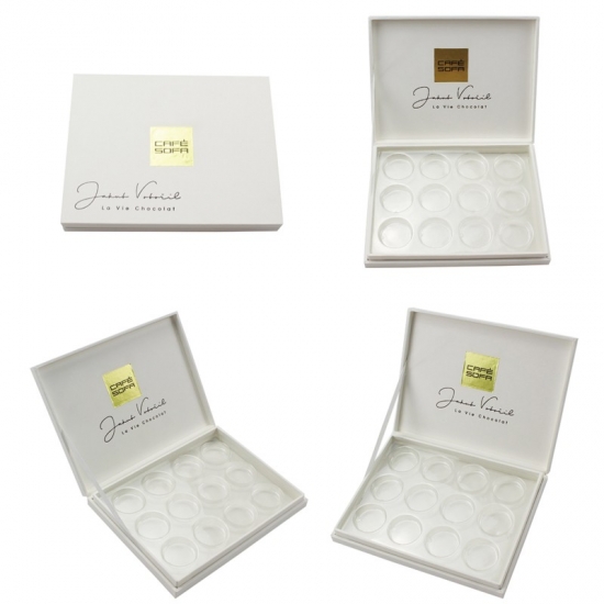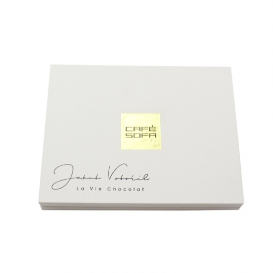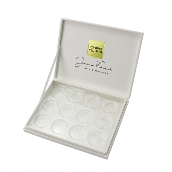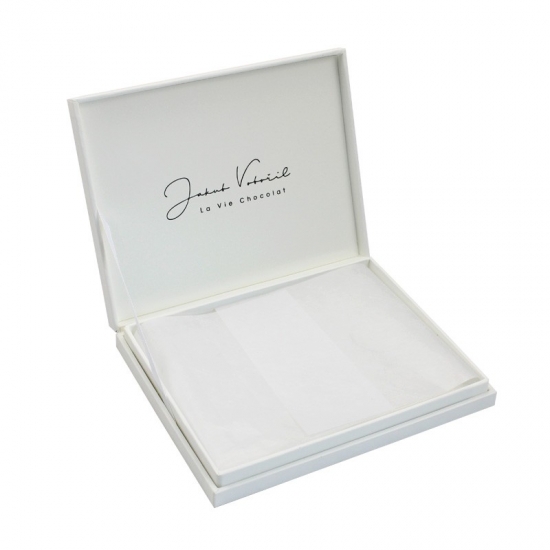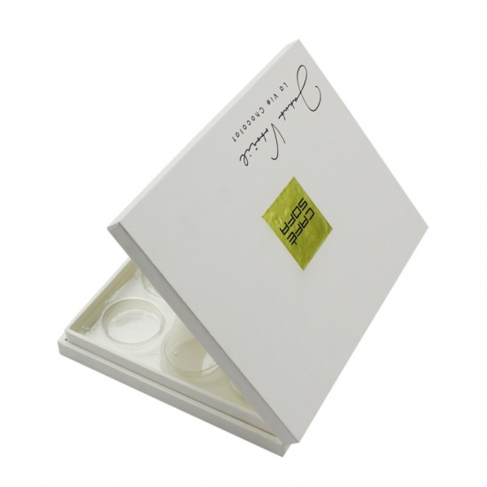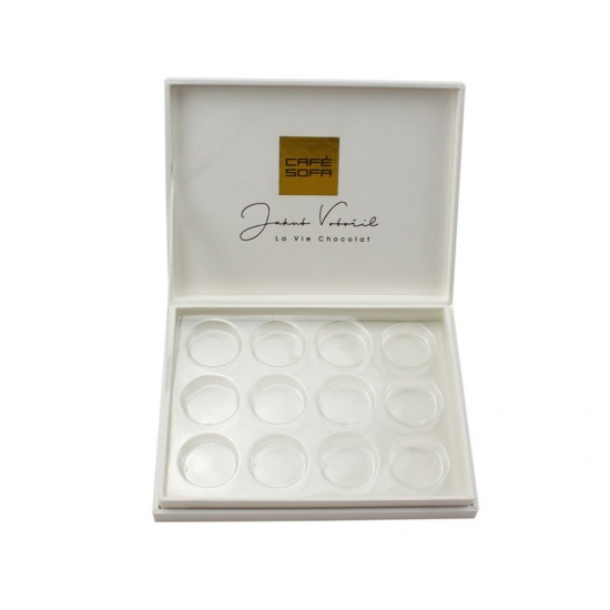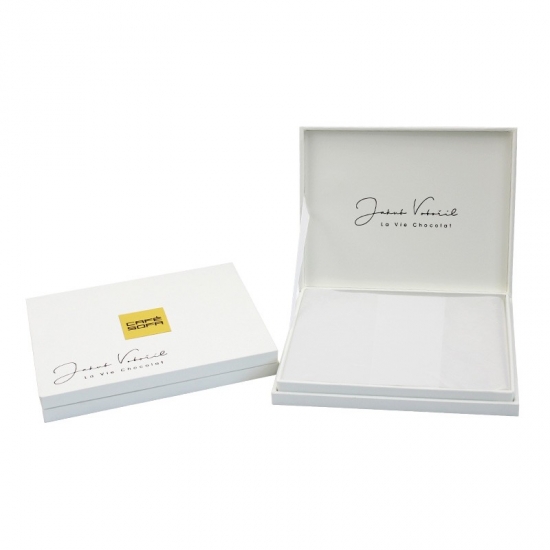 Questo è un scatola di imballaggio di cioccolato bianco che ha fatto da 157 g di carta artistica C2S + 1200 g di cartone grigio, logo esterno della scatola in lamina dorata, vassoio di plastica trasparente all'interno della scatola che può essere personalizzato in base alle tue richieste.