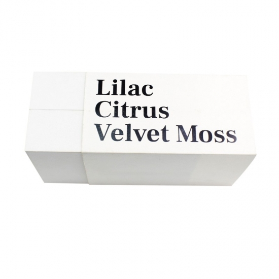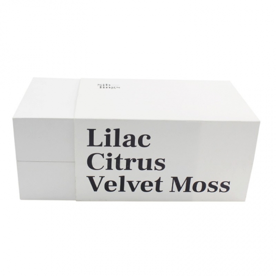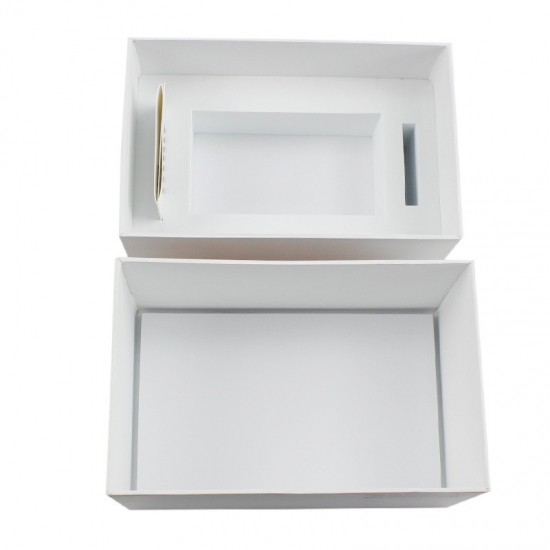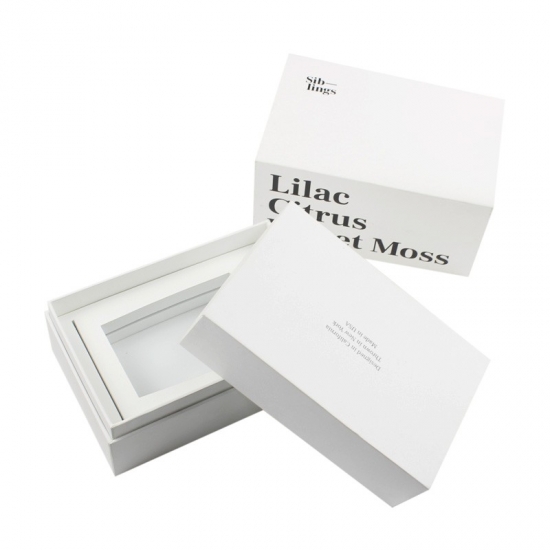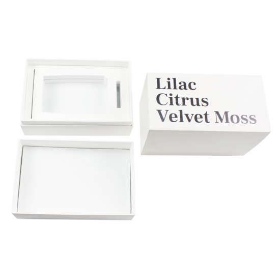 La scatola è realizzata in carta patinata da 157 g e cartoncino grigio, e misura 29 cm di lunghezza x 17 cm di larghezza x 11 cm di altezza. Su un lato della scatola è stampato un testo personalizzato e sul coperchio superiore è presente un logo nero.