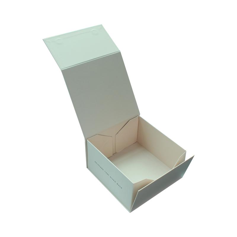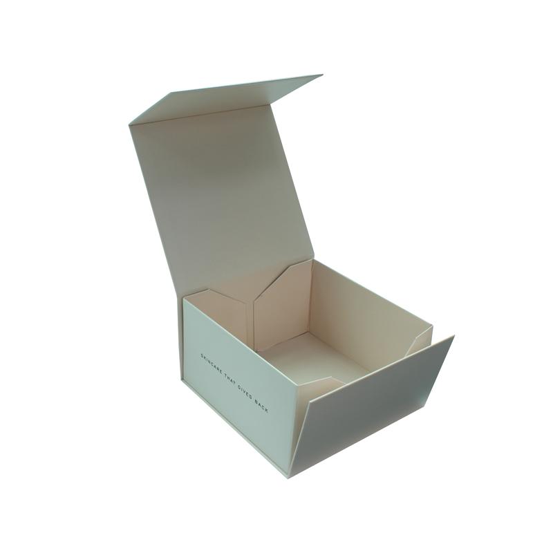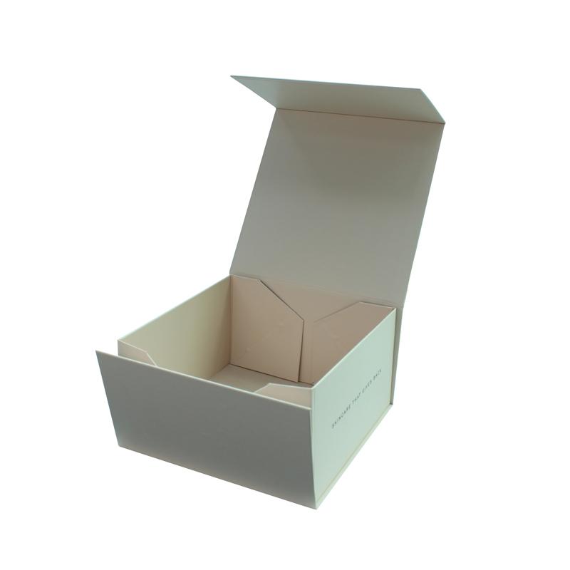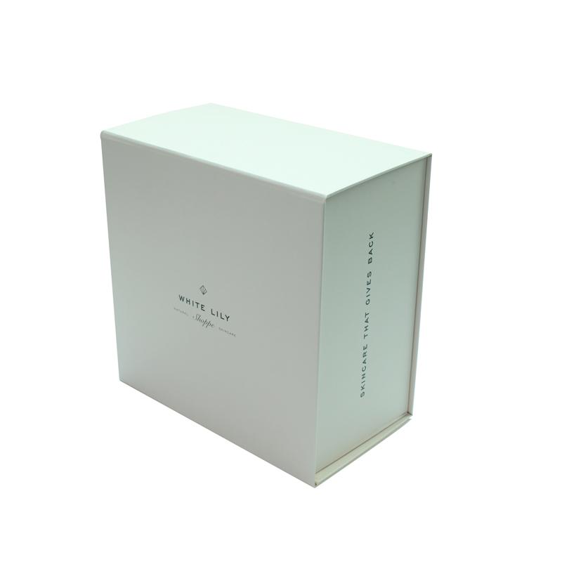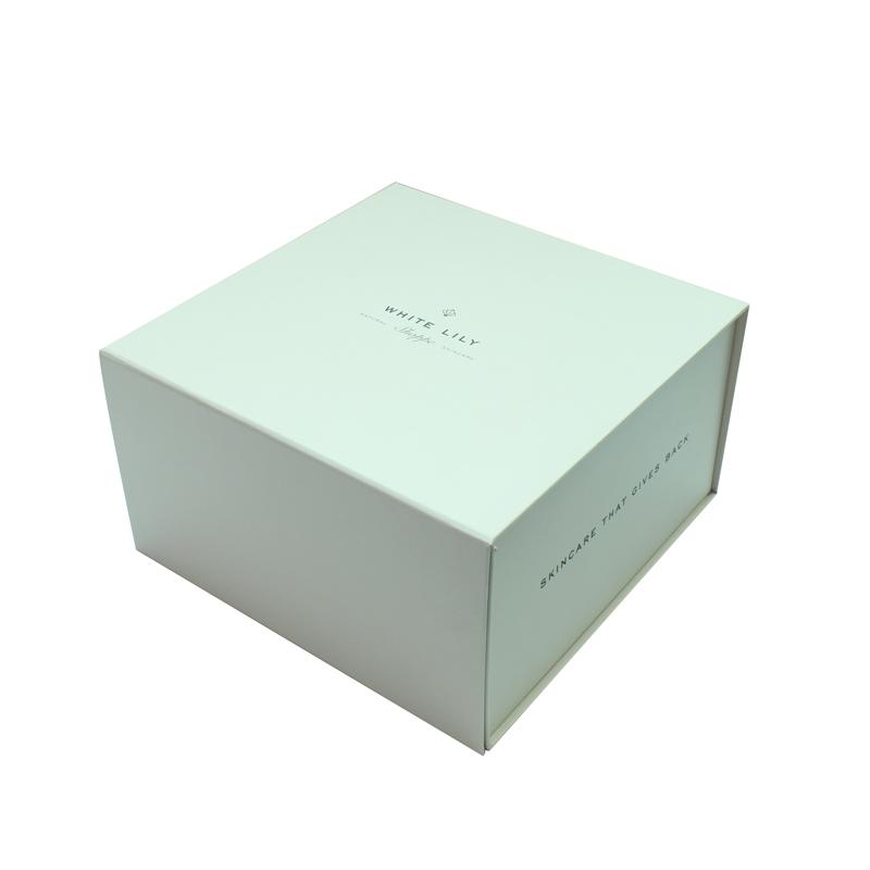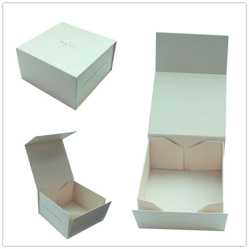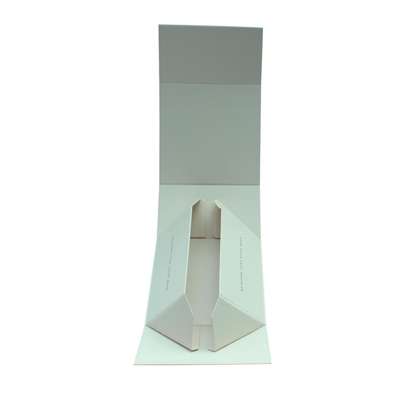 Scatola di cartone pieghevole con laminazione lucida di alta qualità, realizzata in carta patinata e cartone grigio con chiusura magnetica. Solitamente utilizzata per imballare scarpe, vestiti e altri prodotti di consumo.