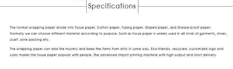 Le dimensioni standard della carta velina sono circa 15'' x 20'' o 20'' x 30''. Le dimensioni possono essere personalizzate. |