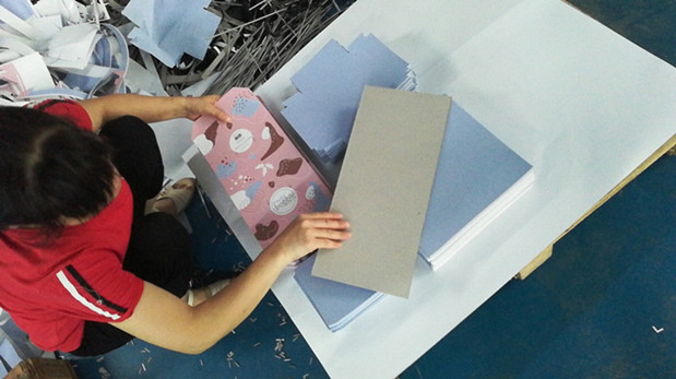Dopo la stampa e la protezione con pellicola, la carta verrà fustellata in base alla struttura della scatola. Con l'aiuto della macchina, i nostri esperti artigiani hanno assemblato la carta con cartone rigido di alta qualità.