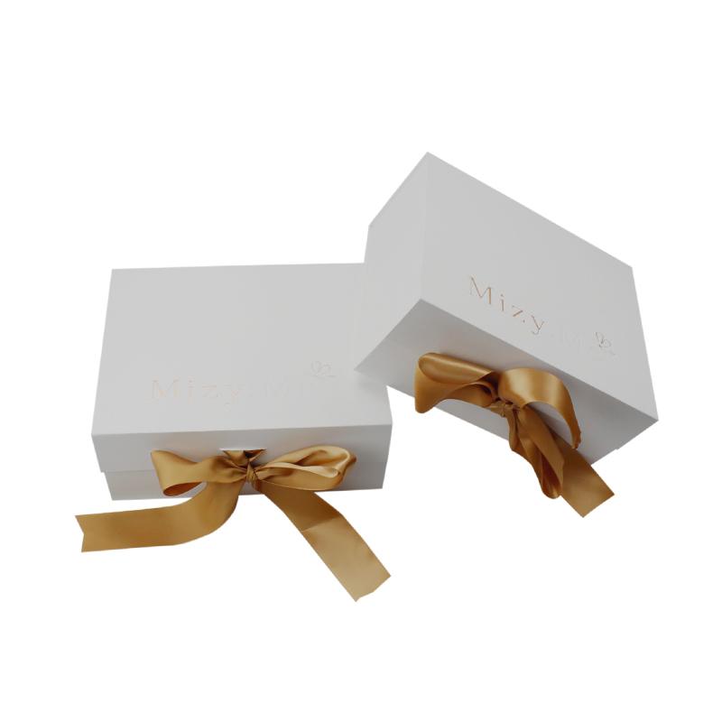 Questo è un scatole regalo magnetiche bianche che ha fatto con carta speciale + cartone grigio da 1200 g, logo stampato in lamina d'oro + impresso sulla parte esterna della scatola e la chiusura con nastro attaccato corrisponde al colore del logo, bianco semplice senza stampa all'interno della scatola. Possiamo personalizzare le dimensioni in base alle tue richieste.