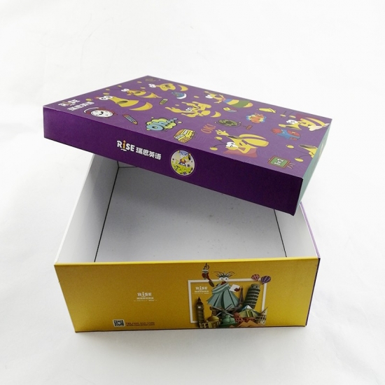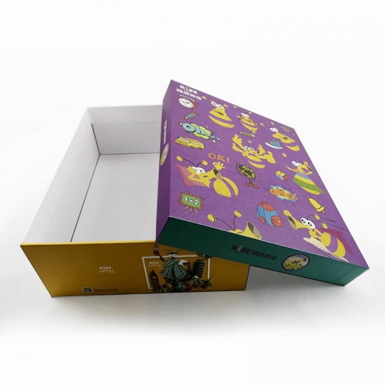 Questa è una grande scatola regalo rettangolare con motivo colorato e coperchio realizzata su carta patinata C2S da 157 g + cartoncino grigio da 1200 g, plastificazione opaca all'interno, colore bianco tinta unita.