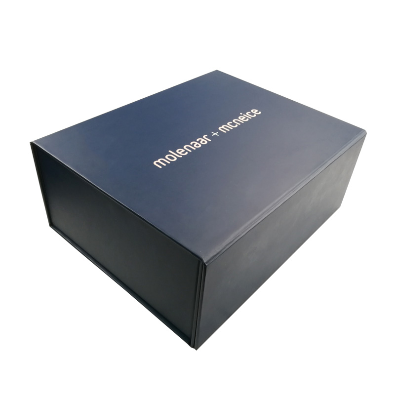 Questo è un colore blu opaco grandi scatole pieghevoli piatte che ha fatto da 157 g di carta patinata C2S + 1200 g di cartone grigio, stampa a colori sia all'esterno che all'interno della scatola con logo stampato in lamina d'oro, sono presenti nastri biadesivi sui quattro angoli della scatola di base.