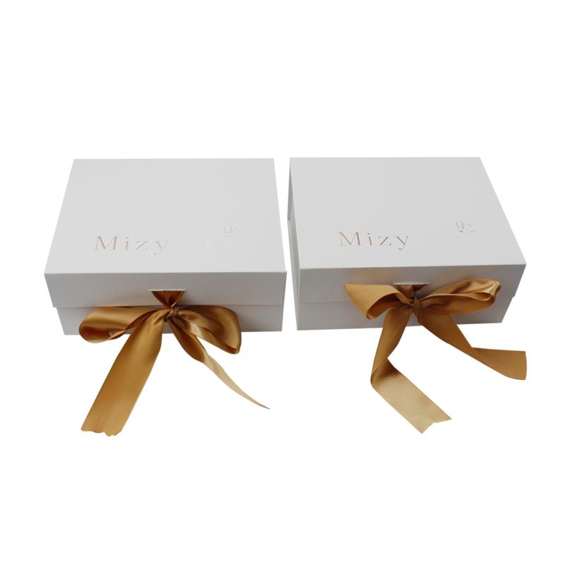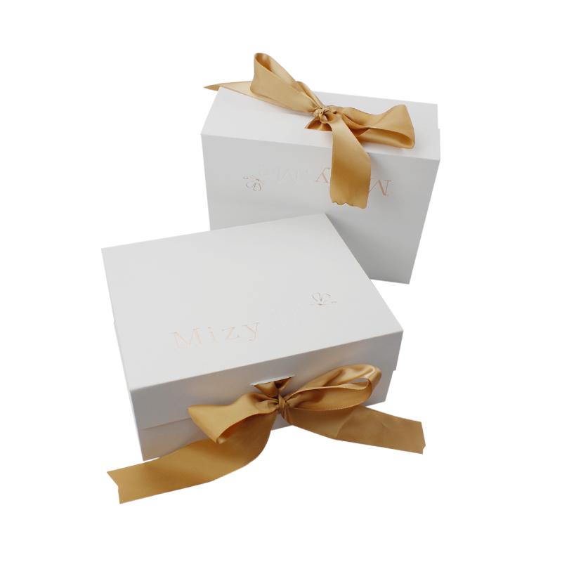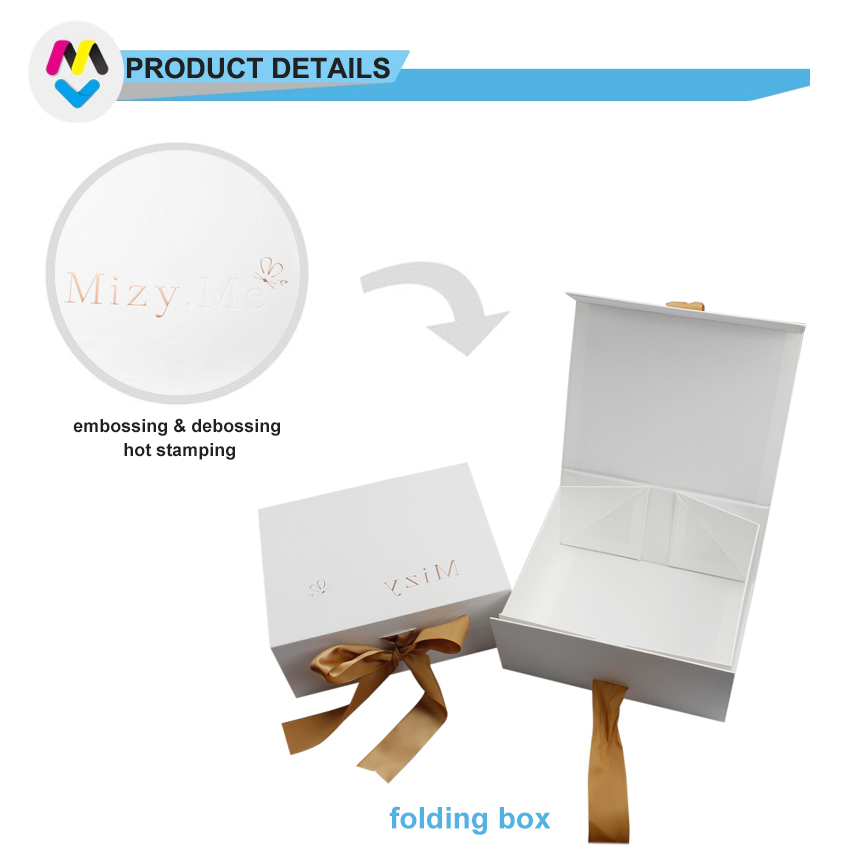 Questo è un bianco scatola regalo con coperchio magnetico che ha fatto realizzato con carta bianca speciale + cartone grigio da 2 mm, il logo sulla parte esterna del coperchio è stampato in lamina d'oro e impresso sulla parte superiore del coperchio, abbinato al nastro color oro.