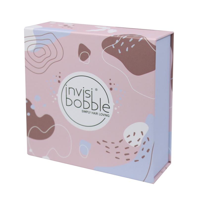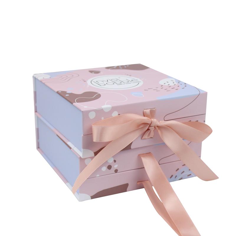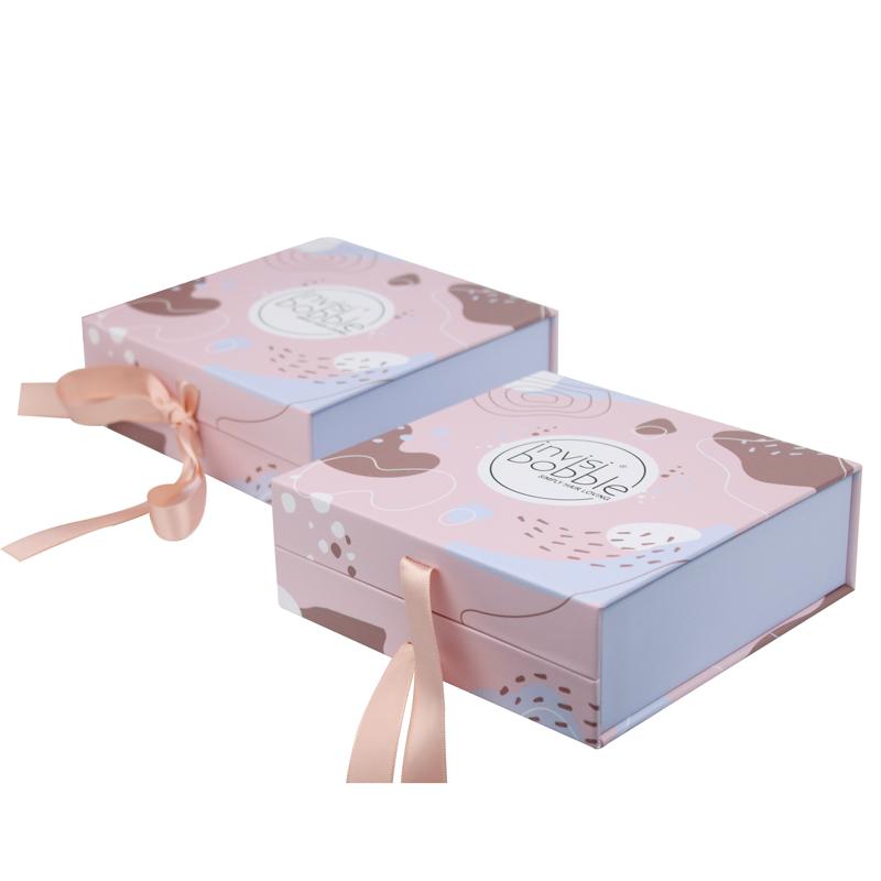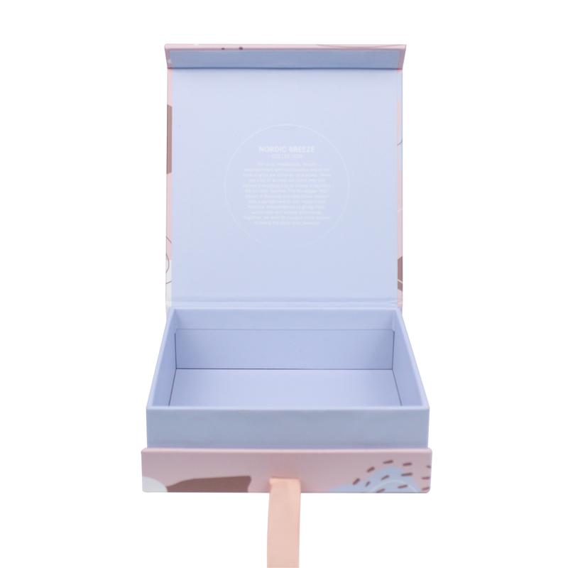 Scatola di lusso dal design accattivante con chiusura a nastro, realizzata in truciolato da 2 mm per darle la forma desiderata. La chiusura a nastro rende la confezione sorprendente da aprire. La stampa in rosa e blu e la finitura superficiale opaca conferiscono all'intera scatola un aspetto elegante e uniforme.