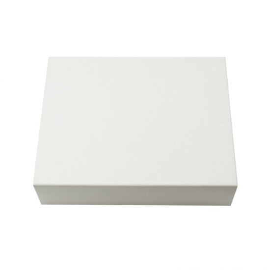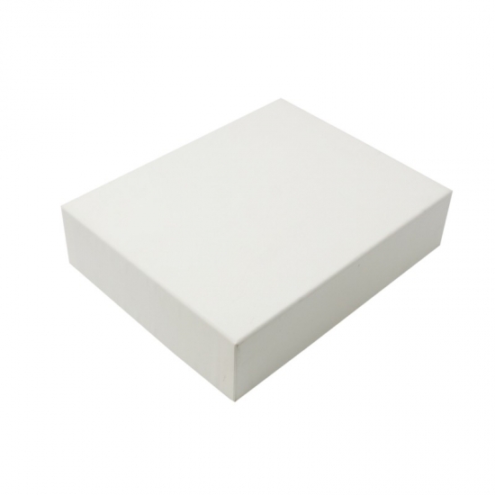La scatola è realizzata in carta patinata da 157 g/m² e cartoncino grigio da 2 mm. Le dimensioni sono 16 x 12 x 3 cm, utilizzate principalmente per l'imballaggio. È di colore bianco puro, senza logo personalizzato. Lo stile è semplice.