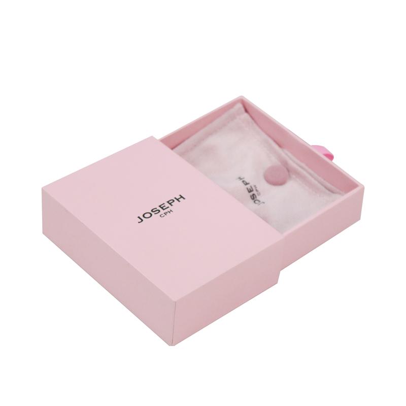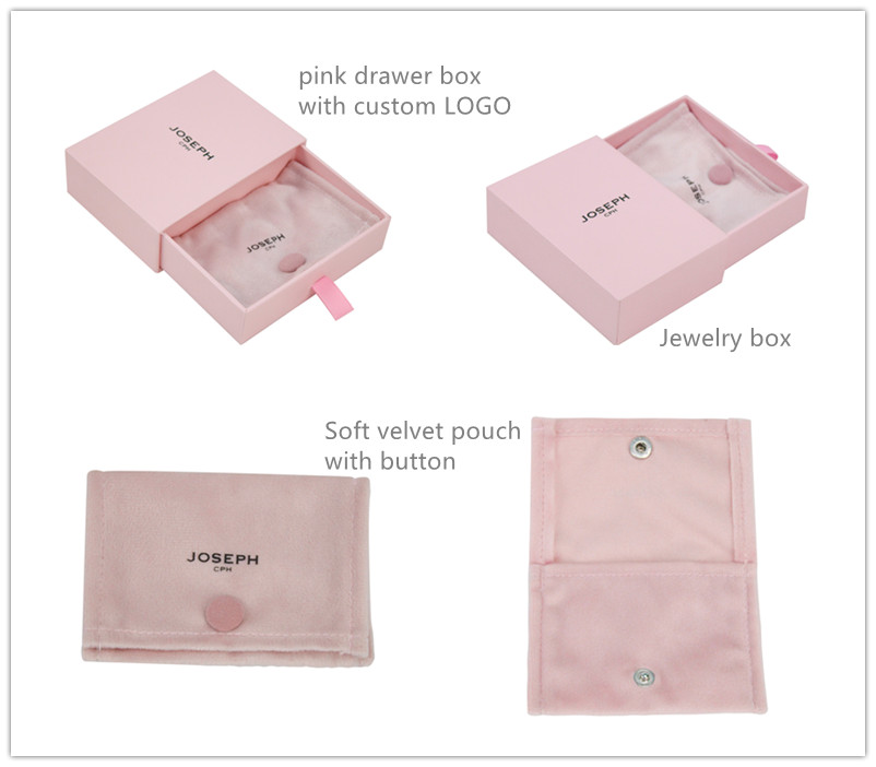 È un scatola portagioie che ha fatto con carta speciale rosa + cartone grigio da 2 mm , pieno di stampa rosa sul lato anteriore e posteriore con logo e testo, custodia in velluto di buona qualità con lo stesso logo della scatola.