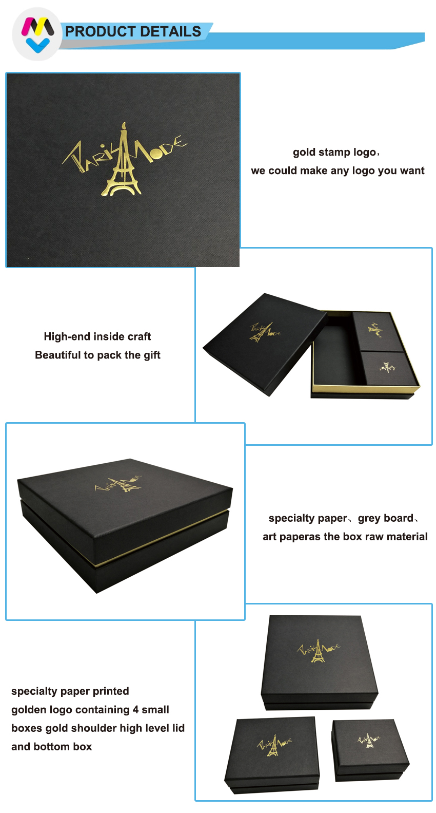 Questa scatola regalo con coperchio è realizzata in cartoncino goffrato nero da 120 g/m² con logo personalizzato stampato a caldo in lamina d'oro. La spalla è realizzata in cartoncino dorato da 153 g/m², che richiama il logo dorato per un tocco di eleganza. All'interno sono presenti anche 4 piccole scatole realizzate con lo stesso materiale e rifinite, utilizzate per confezionare diversi articoli e presentare un regalo speciale a clienti o amici.