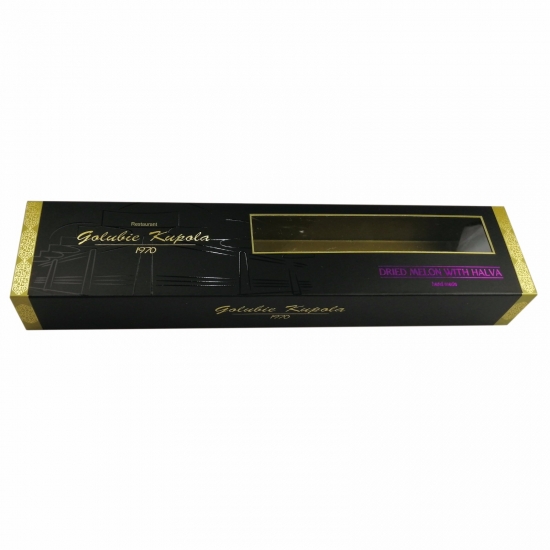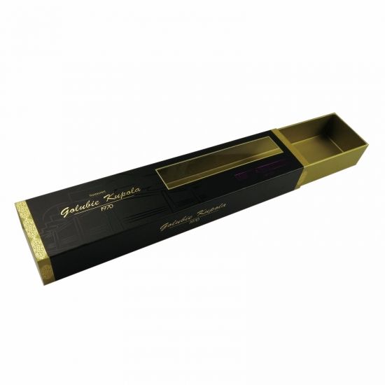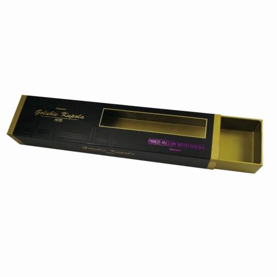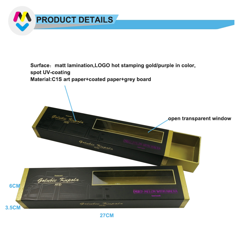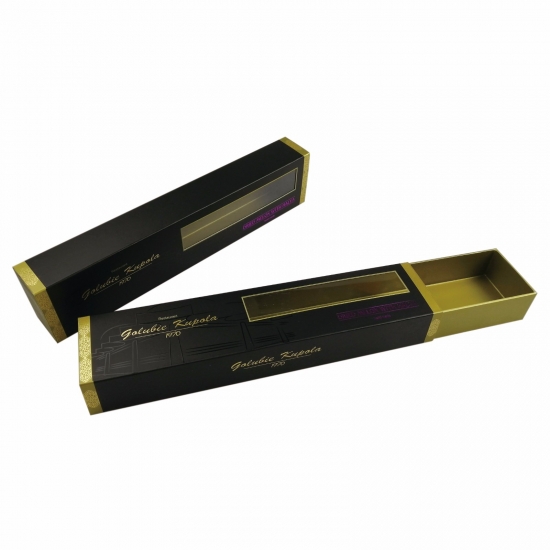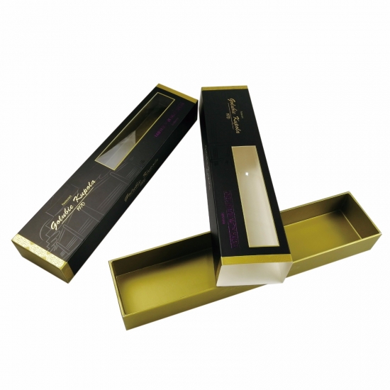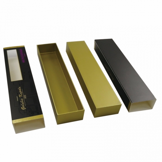 Scatola rettangolare con finestra trasparente in PVC, stampa a caldo multicolore e cassetto in carta con rivestimento UV spot.