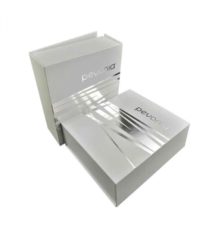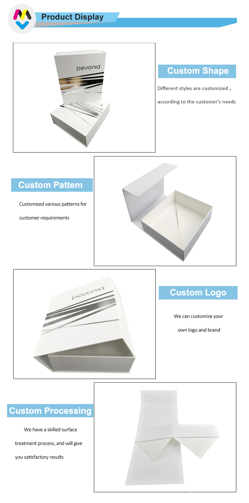 Realizzata in carta patinata da 157 g + cartone grigio da 2 mm, con stampa a caldo argentata del LOGO. Questa è una scatola pieghevole insolita, pieghevole in due pezzi, adatta a scatole con un rapporto di altezza più elevato.