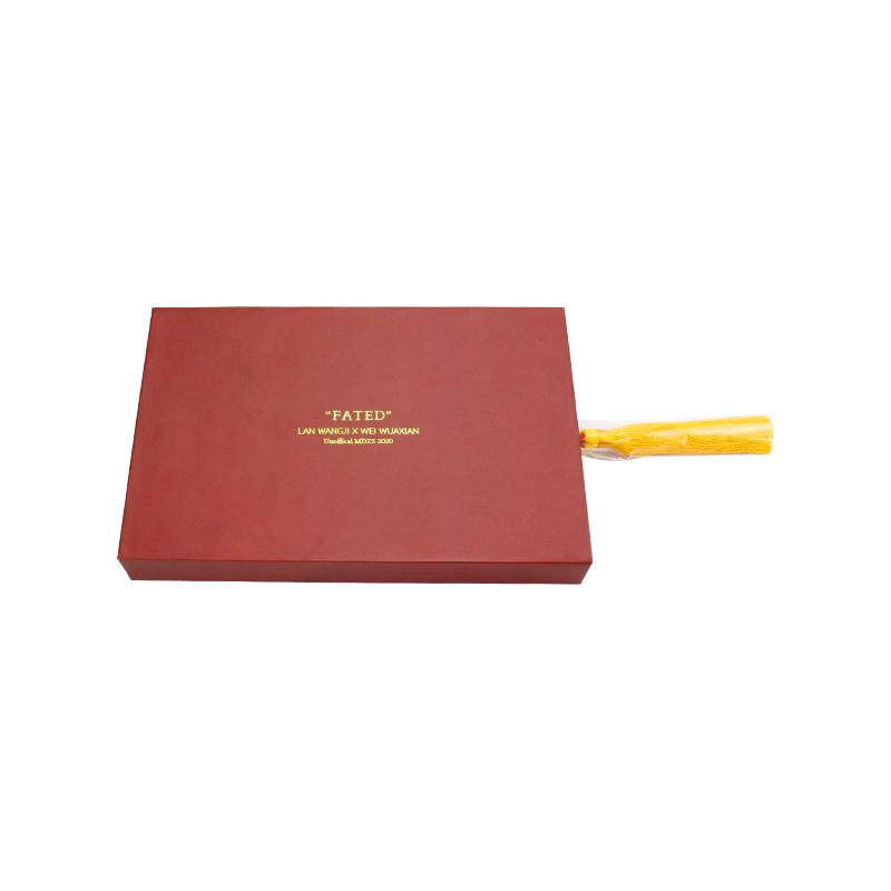 È un scatola regalo scorrevole con ciondolo dorato che ha fatto da 157 g di carta artistica C2S + 1200 g di cartone grigio , pieno di stampe all'esterno e all'interno della scatola con stampa a caldo del logo, ci sono biglietti d'auguri personalizzati in base ai prodotti all'interno della scatola.