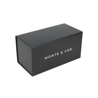 Scatole rigide personalizzate con stampa a colori neri, coperchio con chiusura magnetica e logo con verniciatura UV spot sulla parte superiore della scatola.