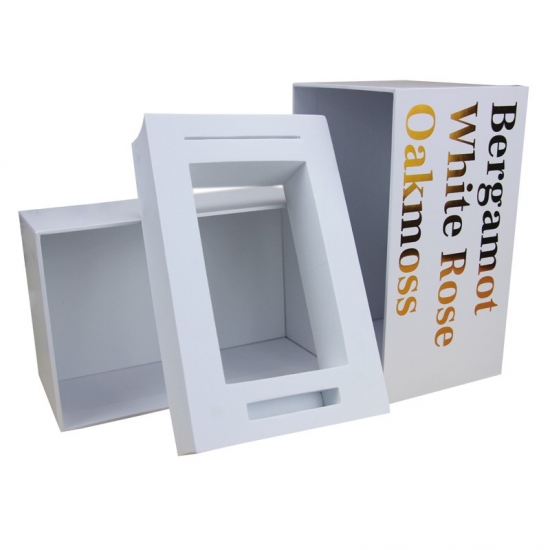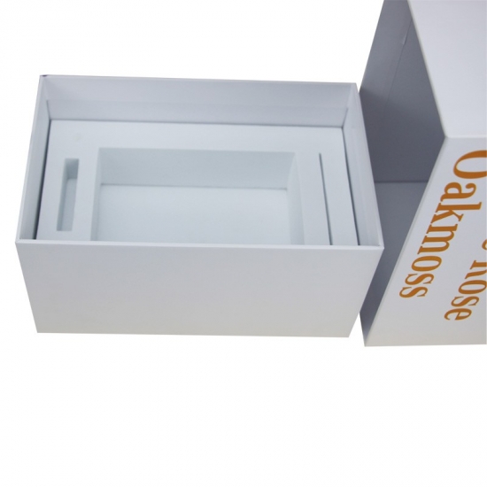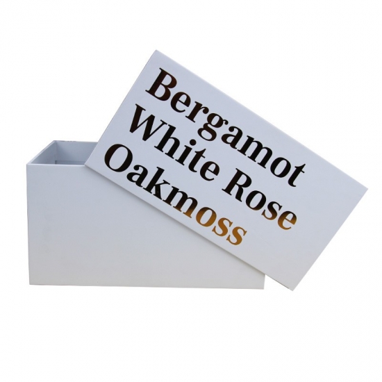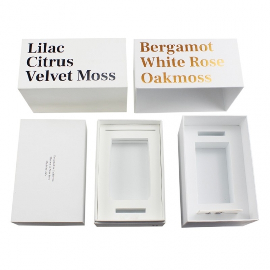 Questo è un scatola di candele bianca con coperchio che ha fatto con carta artistica C2S da 157 g + cartoncino grigio da 1200 g, pieno di testo su un lato con stampa a lamina dorata, la schiuma EVA personalizzata può essere modellata di conseguenza.