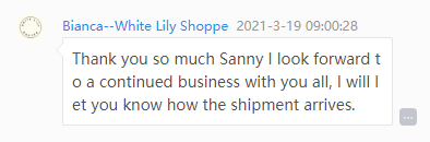 Due settimane dopo, Bianca mi ha trovato di nuovo e mi ha chiesto i dettagli del campione. Dopo aver confermato tutti i dettagli, Bianca Abbiamo pagato la quota per il campione. Qualche giorno dopo, le abbiamo inviato foto e video dei campioni per conferma, e lei è rimasta molto sorpresa. Ci ha detto che aveva già scelto un'altra azienda per realizzare un campione, ma che non aveva soddisfatto le sue aspettative, quindi ci ha chiesto di realizzare un campione per la seconda volta. Ovviamente, Bianca Questa volta è molto soddisfatto del campione.