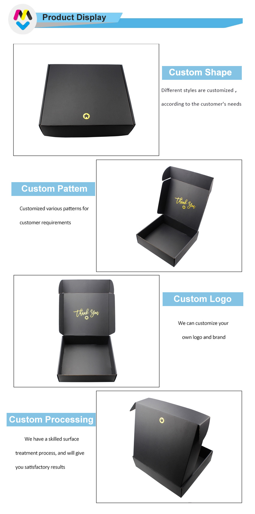 Stile personalizzato di scatola per la spedizione nera, è Ampiamente utilizzato su vari prodotti, l'esterno è di colore nero con logo personalizzato e l'interno è di colore bianco con motivo personalizzato.