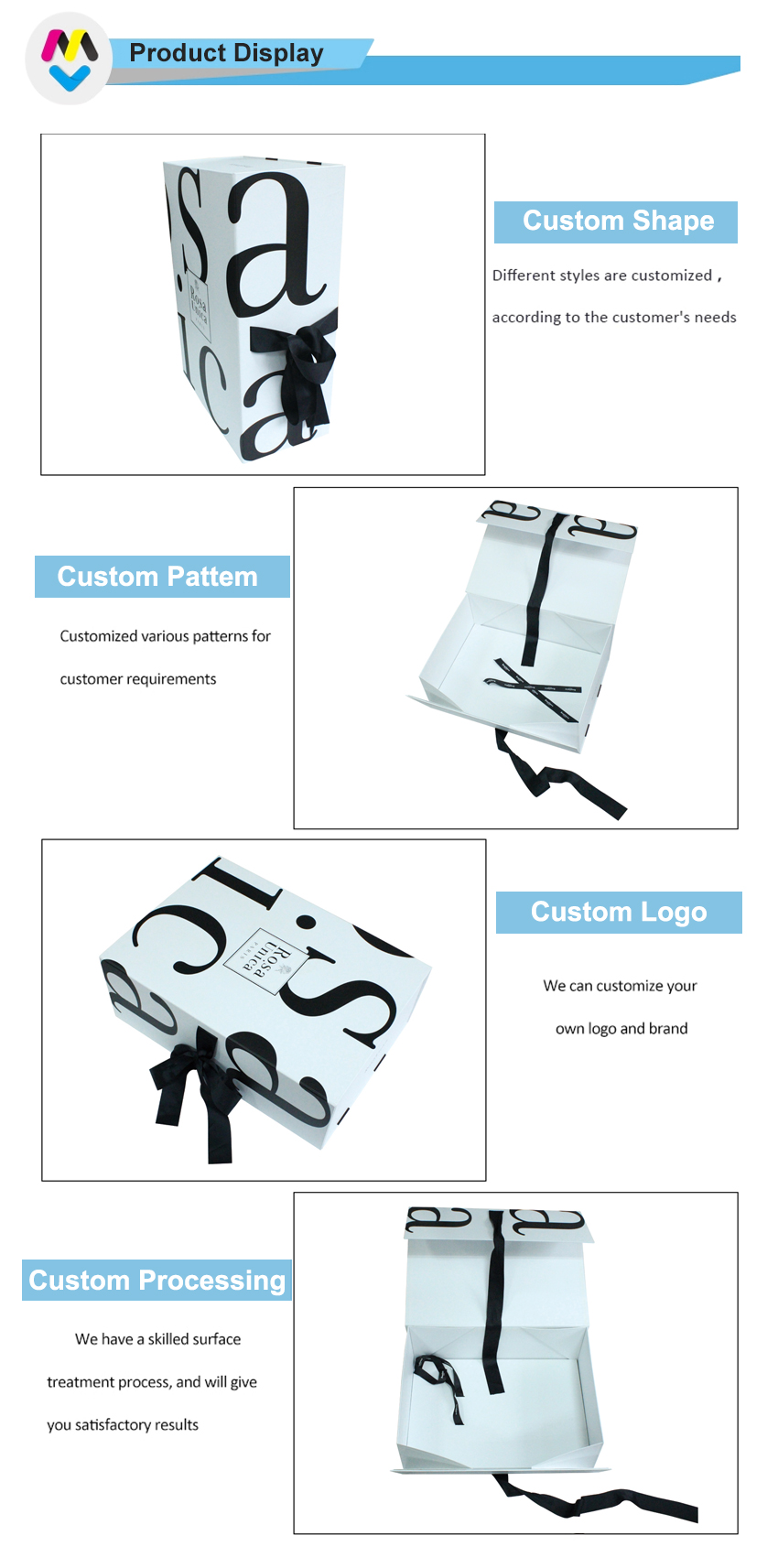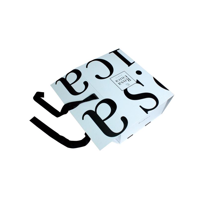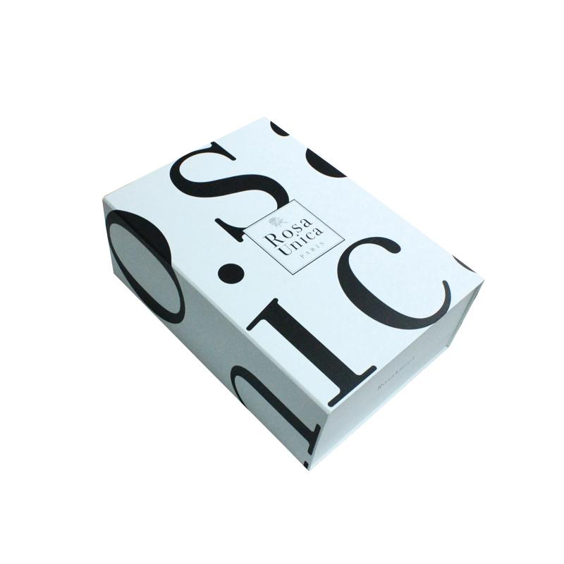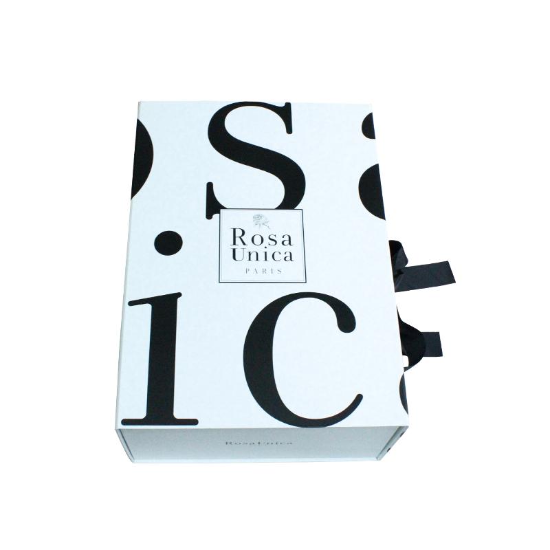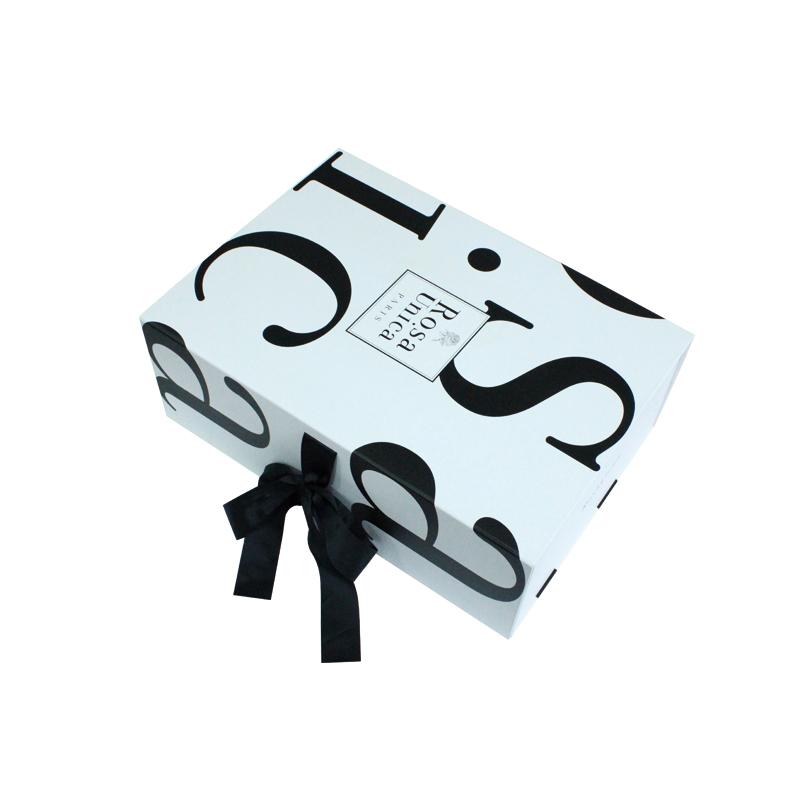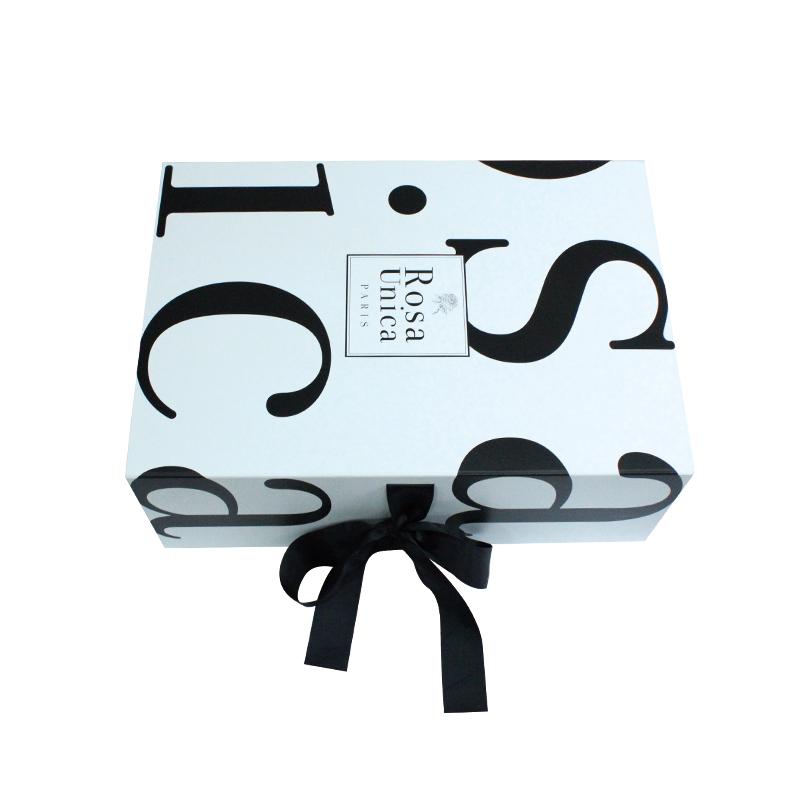 Questa è una scatola regalo pieghevole di grandi dimensioni in truciolato bianco con logo nero e nastro, realizzata da Carta patinata C2S da 157 g + cartoncino grigio resistente da 1800 g e la scatola interna ha un nastro più lungo che passa attraverso i quattro angoli della scatola per rinforzarla, il nastro nero corrisponde al colore del LOGO.