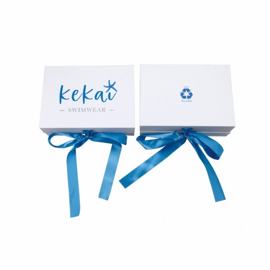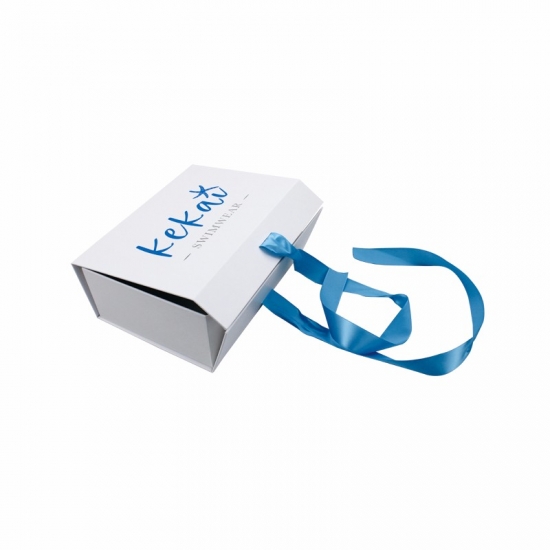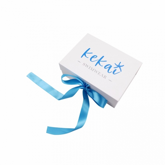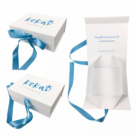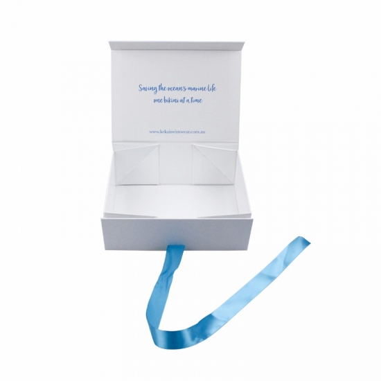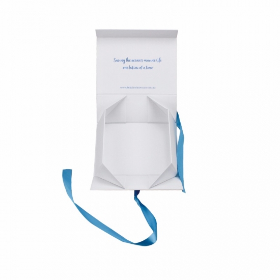 Questo è un colore blu opaco scatole regalo magnetiche pieghevoli che ha fatto da 157 g di carta patinata C2S + 1200 g di cartone grigio, logo blu personalizzato e marchio sia all'esterno che all'interno della scatola con nastro di colore abbinato al colore del logo.
