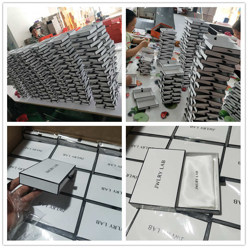 Scatola scorrevole personalizzata , realizzato in carta artistica da 120 gsm, montato con cartone rigido premium da 1200 gsm, con stampa del logo in nero e cornice nera, inserto in sacchetto satinato per confezioni per gioielli