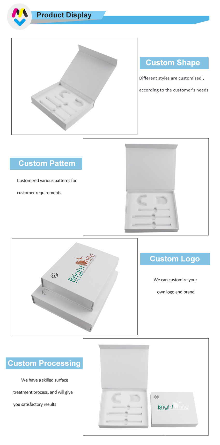 Nota: tutte le foto dei prodotti che abbiamo pubblicato sul nostro sito web sono solo per riferimento sul tipo di imballaggio che possiamo realizzare, non significano che vendiamo lo stesso prodotto in magazzino. Ci concentriamo su imballaggi di carta personalizzati di qualsiasi dimensione/colore/struttura e così via.