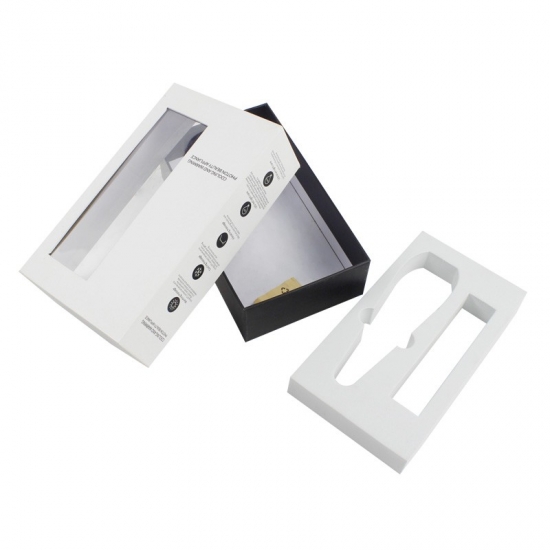 scatole bianche con coperchio realizzate in carta patinata da 157 g/m² e cartone grigio da 2 mm di spessore, con inserto in EVA fustellabile.